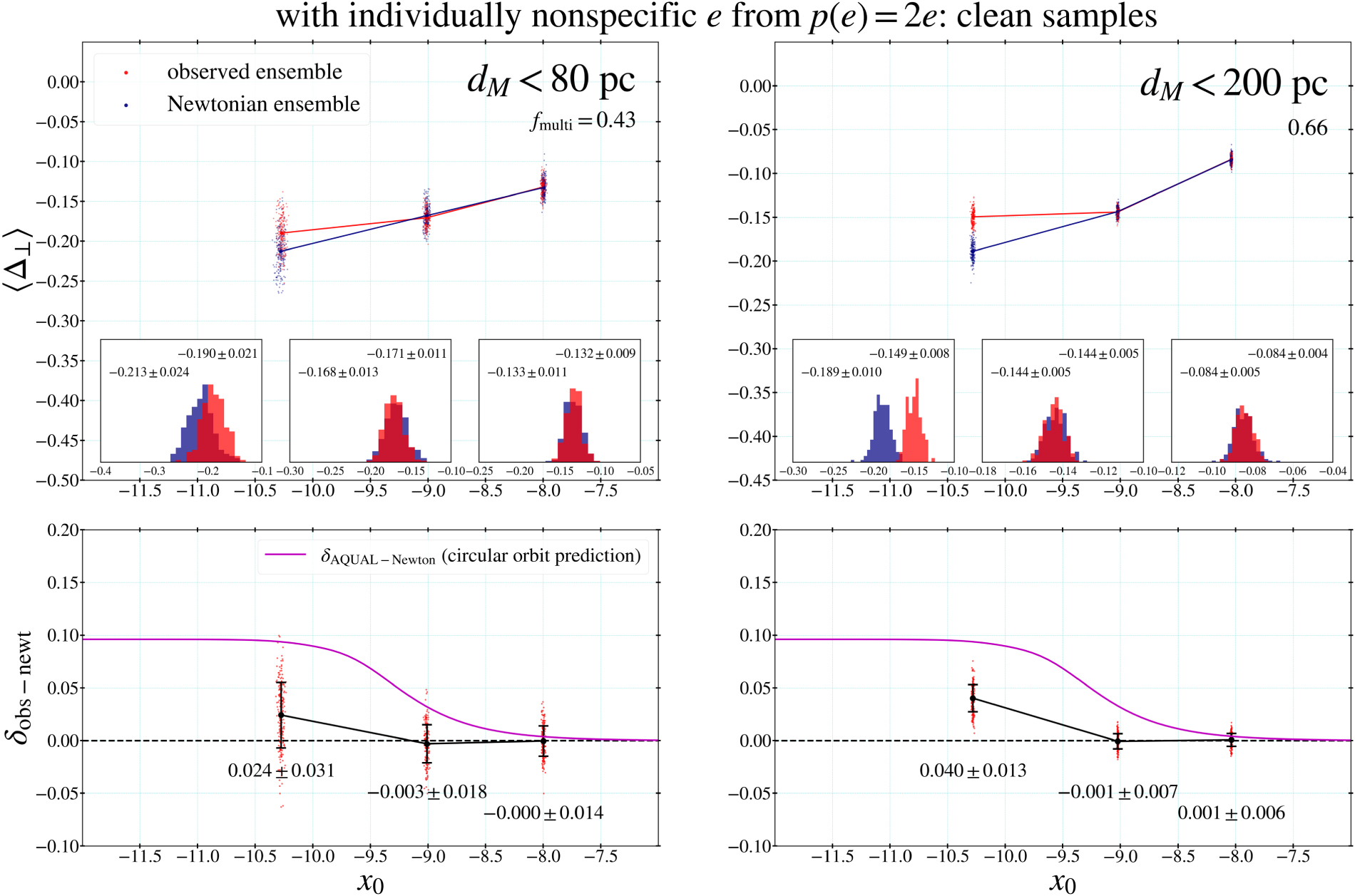 Figure 36 shows the results. These results are deliberately biased in the sense that only binaries having s ≈ 500 au are assigned statistically correct eccentricities, while binaries at weak acceleration are assigned statistically biased eccentricities. In this case, gravitational anomaly is significantly diluted. In particular, the result for the dM < 80 pc sample shows no statistically significant anomaly at all. However, the much larger dM < 200 pc sample still indicates a >3σ anomaly, although the anomaly does not agree with the AQUAL prediction either.