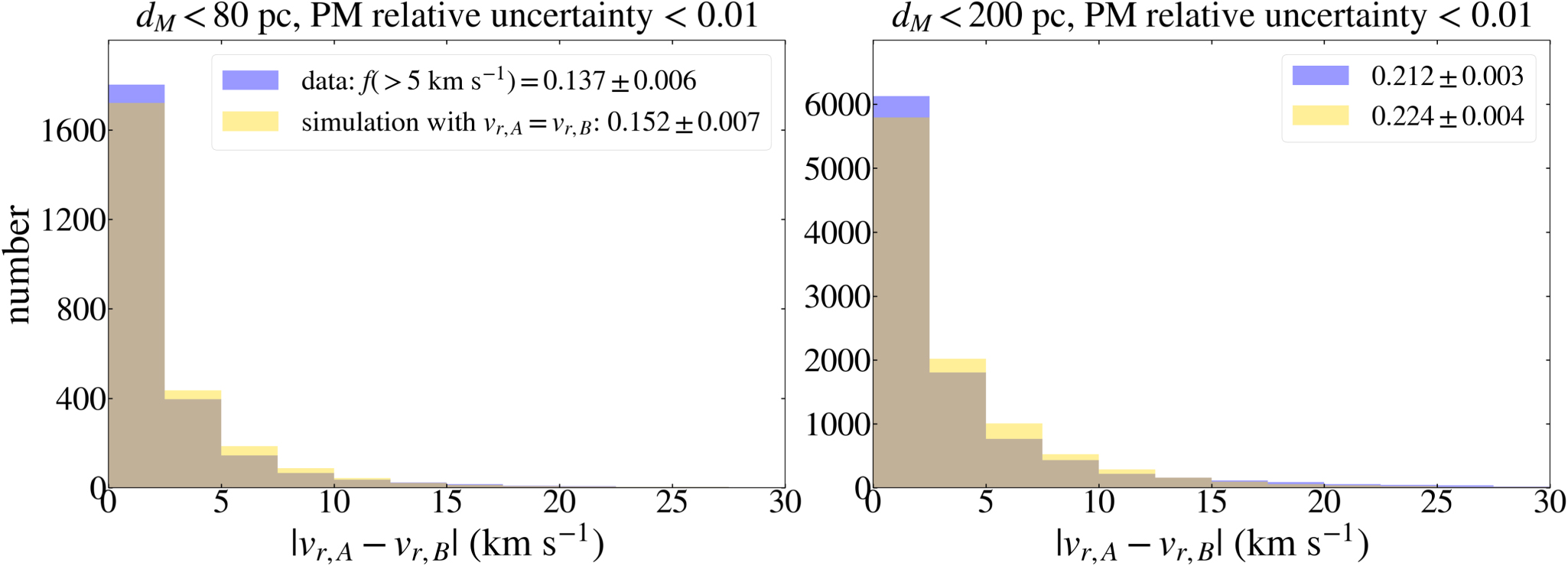 Figure 6. Distributions of the magnitudes of relative radial velocities $\left|{v}_{r,A}-{v}_{r,B}\right|$ between the two components in wide binaries are shown for the dM < 80 pc (left) and dM < 200 pc (right) samples. Blue histograms represent measured values while gold histograms are the predicted distributions purely arising from measurement uncertainties under the hypothesis that the two components belong to a genuine binary system, and thus vr,A = vr,B up to measurement uncertainties. The observed fraction of binaries with $\left|{v}_{r,A}-{v}_{r,B}\right|\gt 5$ km s −1) denoted by f(>5 km s −1) is consistent with the Monte Carlo (MC) prediction for both samples. Note that f(>5 km s −1) is higher in the dM < 200 pc sample due to larger measurement uncertainties at larger distances.