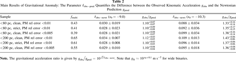 At the time of this writing, the most recent study by Pittordis & Sutherland (2023) had most extensively investigated $\tilde{v}$ distributions for 5 < s < 20 kau based on Gaia EDR3 wide binaries within 300 pc. Their analysis is different from this analysis in many respects, though it is also based on the Gaia EDR3 database. Apart from our use of the acceleration data, most significant differences are as follows. First of all, they consider distributions of $\tilde{v}$ only in wide binaries experiencing weak internal accelerations (≲10−10 m s−2), and thus fmulti could not be self-calibrated uniquely for their sample with wide binaries in a high acceleration Newtonian regime. Moreover, they, in effect, use very narrow acceleration bins by splitting the separation range into narrow bins: 5–7.1 kau, 7.1–10 kau, 10–14.1 kau, and 14.1–20 kau. Second, their sample includes fly-bys, and thus there is a degeneracy in kinematic effects between multiples and fly-bys whereas samples of this study exclude virtually all chance alignments by requiring ${ \mathcal R }\lt 0.01$. Finally, they use individually nonspecific eccentricities from a uniform distribution for all wide binaries regardless of s, whereas this study uses individually specific eccentricities reported by Hwang et al. (2022).