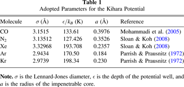 = 0.12, and xAr = 0.01 after normalization. In our calculations, we have assumed the formation of Structure I clathrates because CO, the dominant species in our mixture, can only occupy the 51262 cavities present in this structure under typical PSN conditions (Mohammadi et al. 2005; Zhu et al. 2014). Additionally, N2 and Ar occupy the 512 cavities present in both clathrate Structures I and II. Our calculations have been performed via the use of a statistical mechanics model (van der Waals & Platteeuw 1959; Lunine & Stevenson 1985; Sloan & Koh 2008; Mousis et al. 2010, 2014) that is commonly utilized in the industry and research. The Kihara parameters for the molecule–water interactions employed in this work are listed in Table 1 and correspond to fits to existing laboratory experiments.