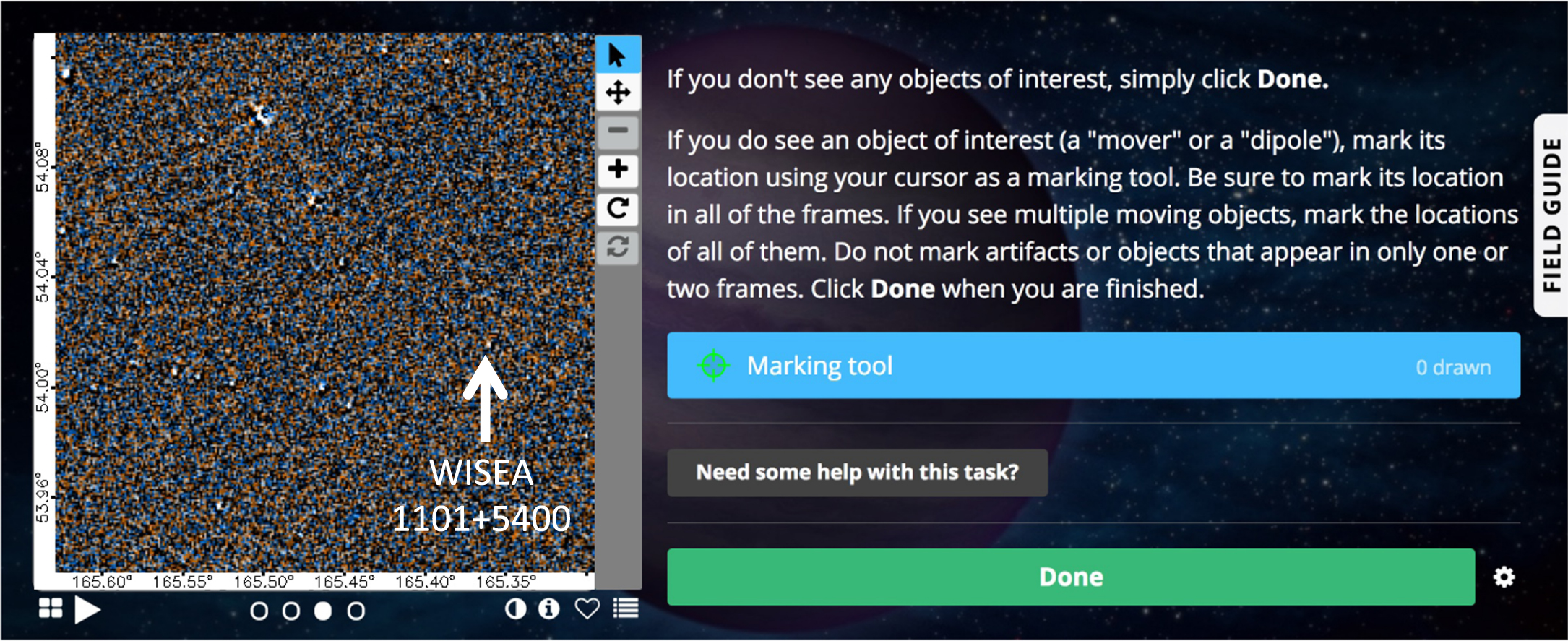 ). On the right is the classification question: "If you do not see any objects of interest... ." When a user hovers over the flipbook, his or her cursor becomes a marking tool and clicking on the flipbook leaves a mark in the form of a green crosshair and records the coordinates of the mark in a file of classification data when the user clicks the blue "Done" button.