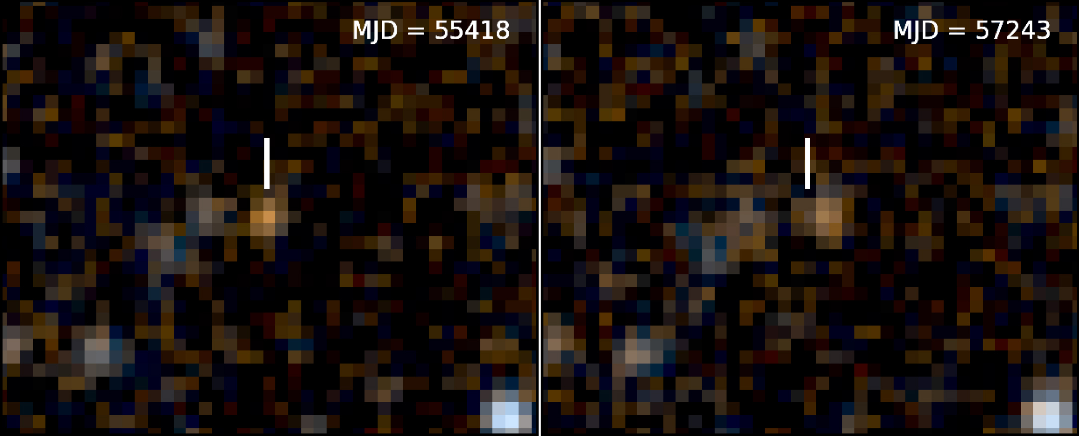 Figure 2. Full-resolution unWISE images of WISEA 1101+5400: a coadd of all pre-hibernation WISE data (left) and a coadd of all second-year NEOWISE-Reactivation data (right). The white vertical line is fixed to highlight the motion of the brown dwarf during the ∼5 year interval. The region shown is