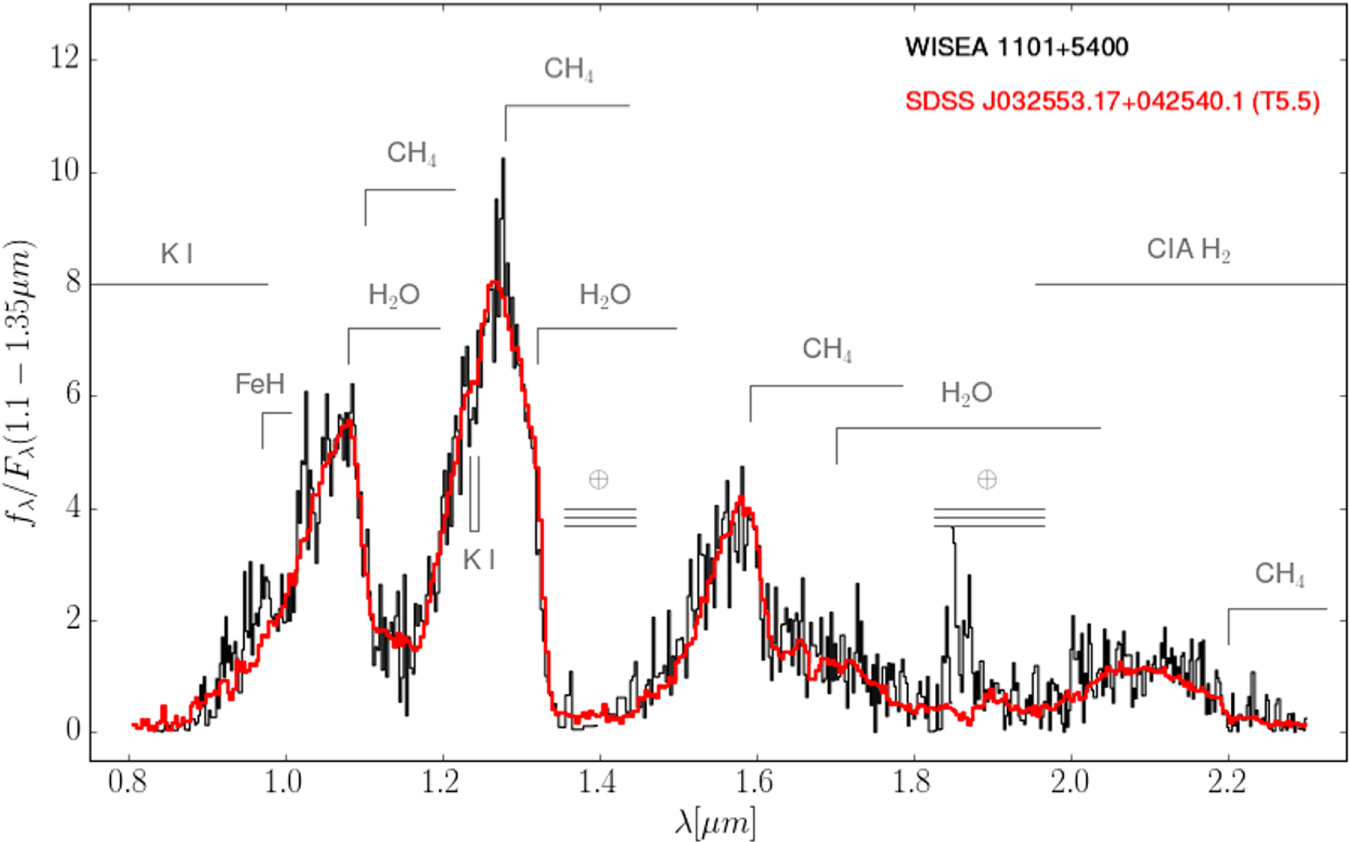 Figure 3. Our SPEX/IRTF spectrum of WISEA 1101+5400 (black) compared to that of SDSS J0325+0425, a field T5.5 dwarf (red). The spectra are normalized in J band. Atomic and molecular opacity sources that define the T dwarf spectral class are indicated.