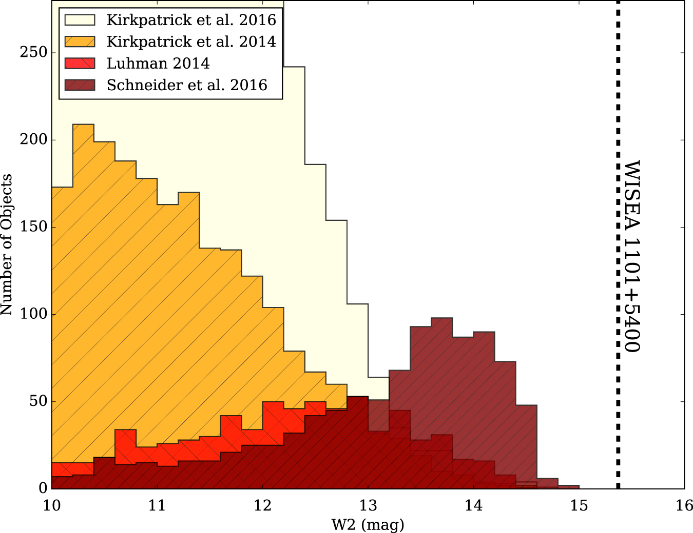 Figure 4. Histograms of the objects discovered by four recent surveys for high proper motion objects with WISE compared to the W2 magnitude of WISEA 1101+5400.