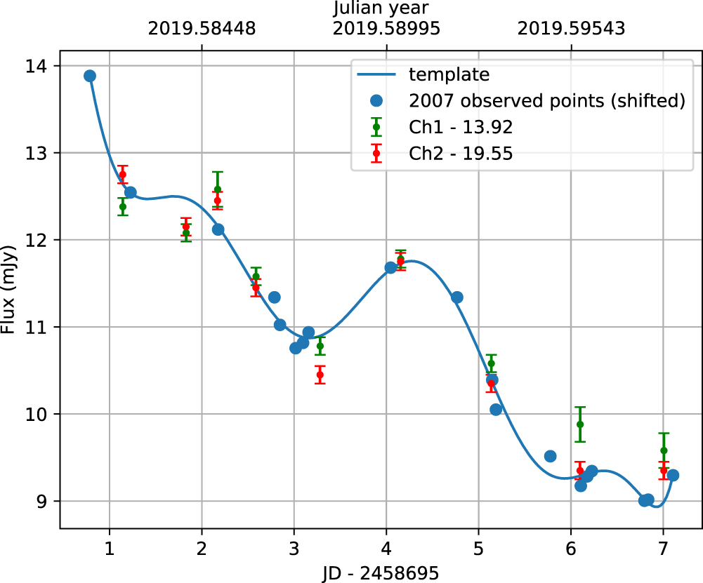 Recall that we predicted the optical R-band lightcurve for the 2019 impact flare from the corresponding observations in 2007. However, our observations of the Eddington flare are in the two near-infrared Spitzer channels. Therefore, it is crucial to estimate how the predicted flare lightcurve should look in the Spitzer bands. In the quiescent state, the infrared–optical wavelength emission comes from synchrotron radiation, and the spectrum follows a power law with a spectral index α ∼ −0.95 (Kidger et al. 2018). In contrast, BH impact flares are dominated by bremsstrahlung radiation, which has a nearly flat spectrum in the near-infrared–optical wavelengths superposed on the usual synchrotron emission. Therefore, we expect that the impact-induced fluxes in the Spitzer bands will be similar to those in the optical bands. However, the base levels of the fluxes in the Spitzer and optical wavelengths should be different during such outbursts due to the steep power-law spectrum of the synchrotron background. Therefore, we subtract the base-level fluxes from the observed Spitzer band fluxes during the outburst to compare with the predicted R-band flux curve. We expect the 2019 impact flare to be coincident in time in the optical and the near-infrared as multiwavelength observations of the 2015 impact flare show no time delay across the relevant wavebands (Valtonen et al. 2016; Kushwaha et al. 2018).