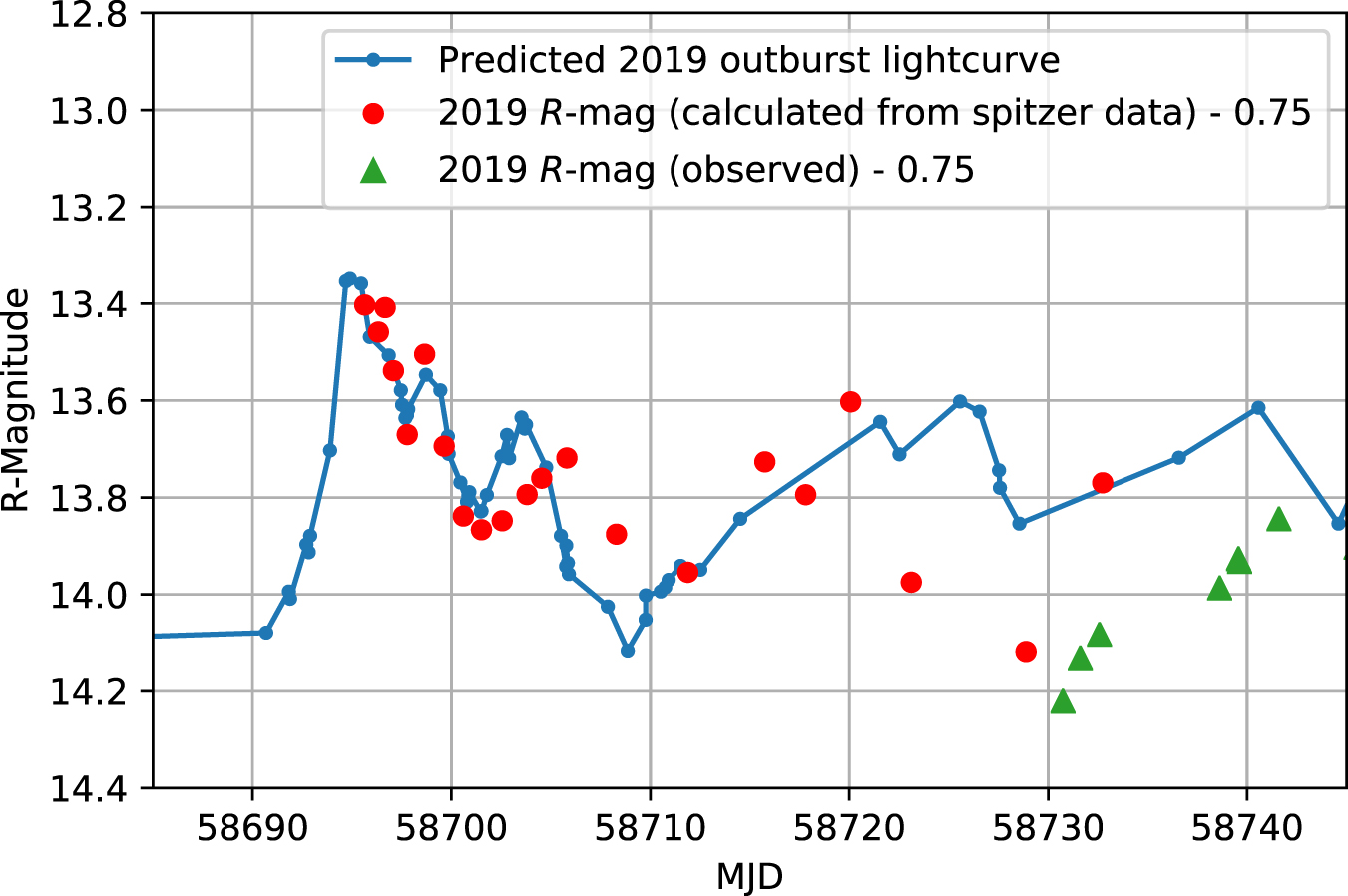 Figure 4. Reconstructed R-band lightcurve (red points) and actual R-band observation (green triangles) along with the prediction (blue line with dots; D18). The red R-band points are constructed from the associated Spitzer fluxes after subtracting the measured 2019 August 16 fluxes as the synchrotron base level and adding our estimated R-band base-level flux of ∼3.73 mJy. Also, we consider α = −0.2 while converting the Spitzer fluxes to R-band fluxes.