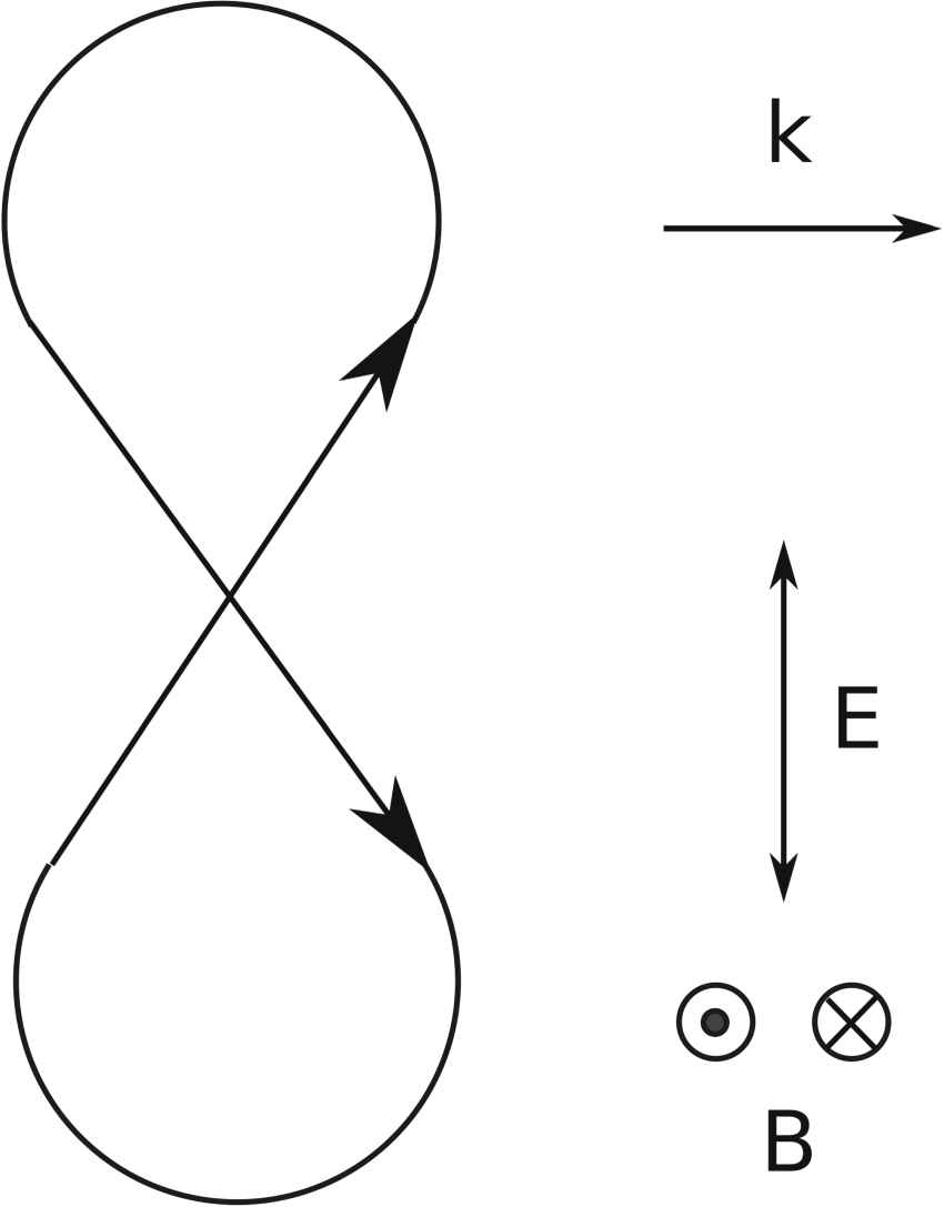 Figure 1. The "figure-of-eight" trajectory of an electron under the strong linearly polarized wave. The arrows on the side denote the polarization of the wave.