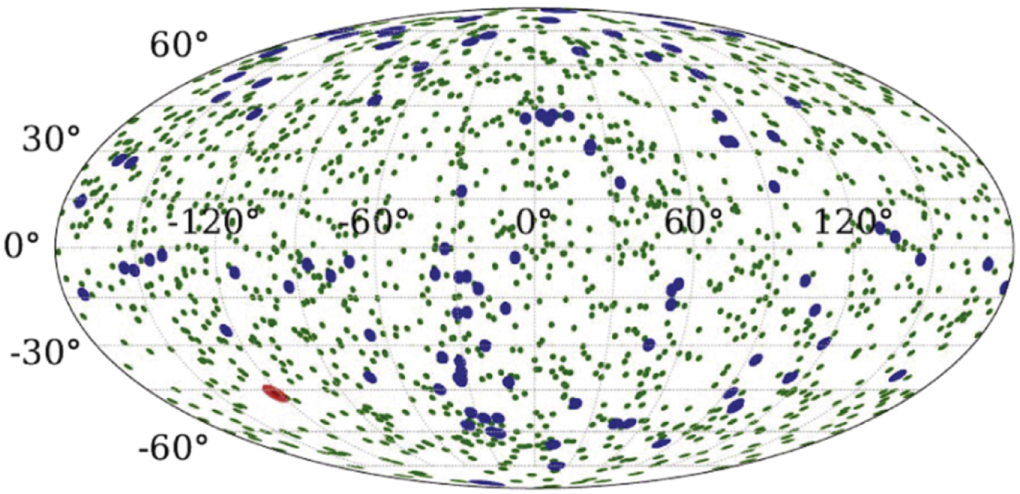 Figure 1. Sky celestial coordinate distributions of 110 FRBs and 1440 GRBs in our sample. The FRBs and GRBs are marked with blue and green circles, respectively. The positions of GRB 110715A and FRB 171209 are highlighted with a red circle.