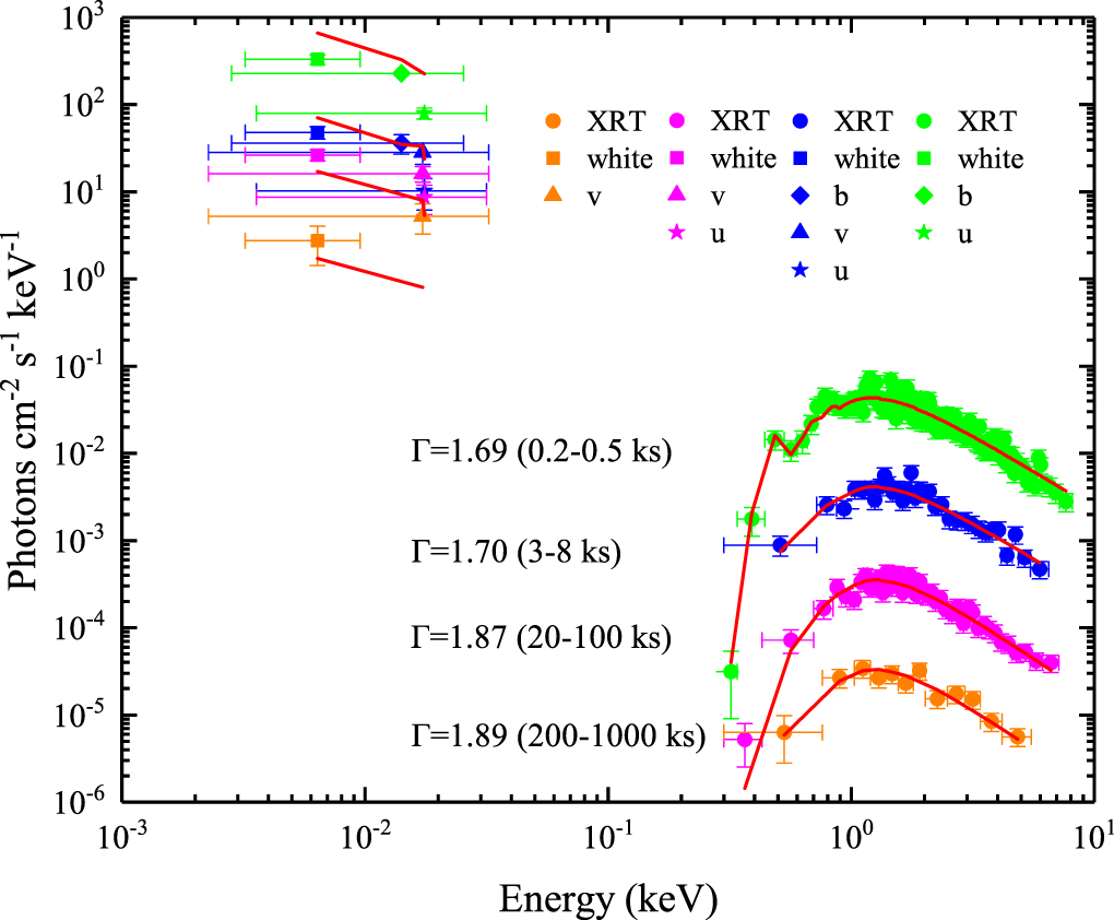 cm−2 is derived from the time-integrated XRT spectrum. We fix these values in our time-resolved spectral fits. We subdivided the broadband data into four temporal ranges (as marked in Figure 4). The SEDs of the joint optical and X-ray spectra can be well fitted with a single absorbed power-law function (as shown in Figure 5). The photon indices Γ (the spectral index β = Γ − 1) are 1.69, 1.70, 1.87, and 1.89 for the Slice 1 (T0 + [200, 500] s), Slice 2 (T0 + [3 × 103, 8 × 103] s), Slice 3 (T0 + [2 × 104, 1 × 105] s), and Slice 4 (T0 + [2 × 105, 1 × 106] s), respectively. There is no obvious spectral evolution observed in the afterglow phase. The temporal slopes of the normal decay phase (