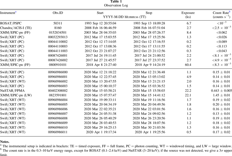 aThe instrumental setup is indicated in brackets: TE = timed exposure, FF = full frame, PC = photon counting, WT = windowed timing, and LW = large window. bThe count rate is in the 0.3–10 keV energy range, except for ROSAT (0.1–2.4 keV) and NuSTAR (3–20 keV); if the source was not detected, we give a 3σ upper limit.Download table as: ASCIITypeset image
