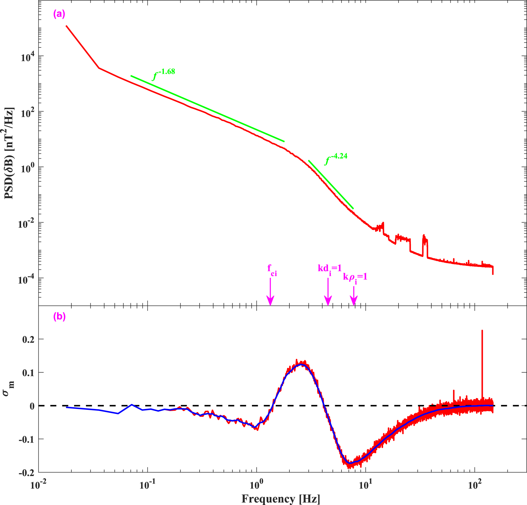 Figure 2. One-day time-averaged (a) PSD of magnetic field and (b) the magnetic helicity σm (the red and blue curves present the origin and smoothed σm). The three vertical arrows from left to right correspond to the proton cyclotron frequency, the Doppler-shifted frequency of the proton inertial length, and proton gyroradius, respectively. Discrete spectral features above 10 Hz are noise from the spacecraft momentum wheels.