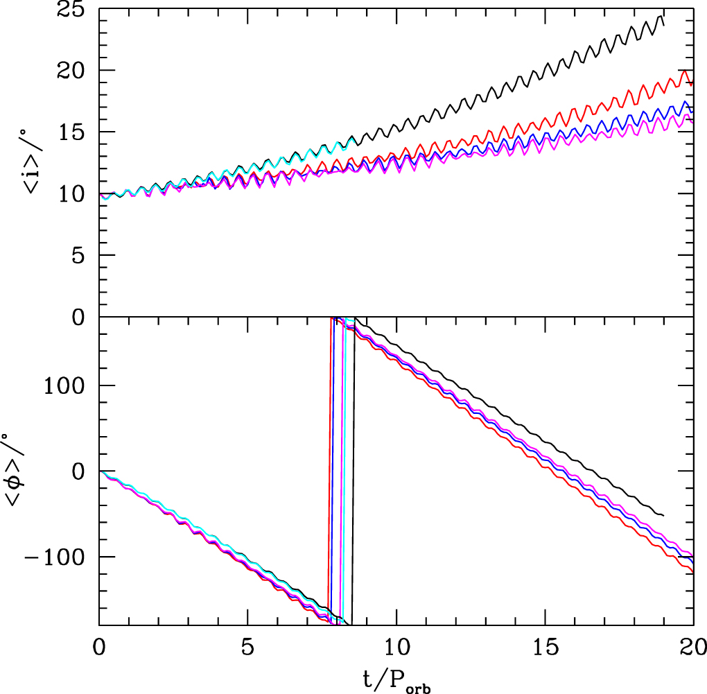 Figure 3. Hydrodynamic simulations of a circumplanetary disk that is initially misaligned by 10° showing the inclination of the disk (upper panel) and the nodal precession angle (lower panel). The angles are averaged by mass over the radial extent of the disk. The SPH simulations have 250,000 particles (red), 500,000 particles (blue), and 106 particles (magenta) initially. The grid simulation results are shown as the black (low-resolution) and cyan (high-resolution) curves. The SPH and grid simulations both have an outer aspect ratio of H/r = 0.1, though they differ in details of the initial disk profile.