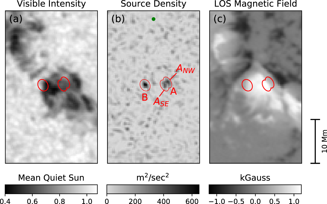 Standard image High-resolution imageFigure 2 illustrates the application of helioseismic holography to helioseismic observations of surface Doppler ripples emanating in the (10 ± 1) mHz spectrum from the flare of 2011 July 30. The observations were tracked regional Doppler movies extracted from the database of the Helioseismic and Magnetic Imager (Scherrer et al. 2012) aboard NASA's space-borne Solar Dynamics Observatory. The middle panel shows a map of the acoustic source density at 02:09:45 TAI, cospatially with the preflare continuum intensity, Ic , (left panel) and the line-of-sight (LOS) magnetic induction, Blos (right panel). The source region is a complex δ-configuration sunspot with an eastern umbra of northern-magnetic polarity (bright in panel c) and whose western counterpart is southern-magnetic (dark). The acoustic source density map (middle panel) shows two compact sources conspicuously above the background noise. The source labeled "B," is planted on the eastern boundary of the eastern umbra. The source labeled "A" is bifurcated, its two kernels, ASE and ANW, straddling a sharp penumbral magnetic precipice (right panel) in which the LOS magnetic field grows from 850 Gauss at the center of kernel ANW to 1150 Gauss at the center of kernel ASE.