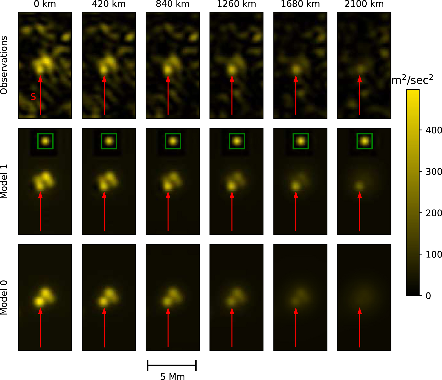 Model 1, then, prescribes a planar distribution of dipolar emitters at a depth in the range (1150 ± 120) km for the deep signature indicated by the red arrow in Figure 3 and a similarly planar distribution of dipolar emitters for the remainder of the signature at a depth in the range (200 ± 100) km. Sources with some degree of vertical extension above or below the respective source planes may be more realistic for reasons having to do with the physics thought to operate in 3D active-region subphotospheres. This degree of sophistication is left beyond the scope of this study, whose essential finding, then, is a strong indication of a component of flare-triggered transient seismic emission that is of the order of about a Mm beneath the Sun's surface.