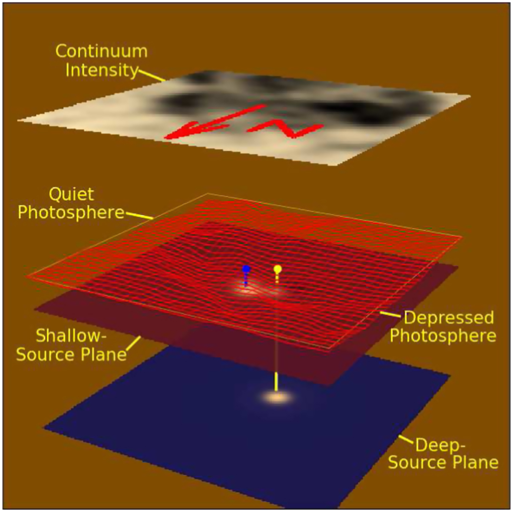 Local helioseismology has developed various techniques to model local acoustic anomalies to which it attributes its helioseismic signatures (Skartlien 2001, 2002; Gizon & Birch 2005; Gizon et al. 2009; DeGrave et al. 2018). These might prescribe continuous acoustic source-power distributions in three-dimensions, i.e., source densities with significant extension in both horizontal and vertical directions, to satisfy the helioseismic signatures presented to them. In this study, we go only as far as to show that the signatures imaged in the top row of Figure 3 can be fit definitively by a relatively simple model with acoustic sources that are dipole emitters continuously distributed over a finite set of separate horizontal planes. We prescribe a forward model in which the primary emission that contributes to the signature designated ANW in the middle panel of Figure 2 and some of the signature designated ASE is distributed over one relatively shallow horizontal plane, while the primary component that contributes to the signature to which the red arrow points in Figure 3 is distributed in a second plane, one distinctly deeper than the first. The acoustic emission from these source distributions is propagated downward and outward, and eventually back upward, to the overlying surface, prescribed by the same Green's function that expresses the wave mechanics in the time-reverse extrapolations that lead to the source density maps imaged in the top row of Figure 3. We then apply the same diagnostics to the surface signatures of the disturbances that emanated from the foregoing emitters as we did to the helioseismic observations to get the source density maps imaged in the top row of Figure 3. We then compare the two. The individual depths of the shallow and deep planes in our model are adjusted, along with the source-density distributions in each plane, to minimize the mean square deviation in focal planes at depths 0.2 and 1.1 Mm. To the eventual result we give the name "Model 1," and this is represented diagrammatically in Figure 4. The acoustic source-density maps that result from Model 1 are imaged in the middle row of Figure 3. The best fit of these maps to those in the top row of Figure 3 was accomplished by fixing the shallow-source plane (magenta) in Model 1 (200 ± 100) km beneath the quiet photosphere, and the deep one (deep blue; 1150 ± 120) km beneath the same.
