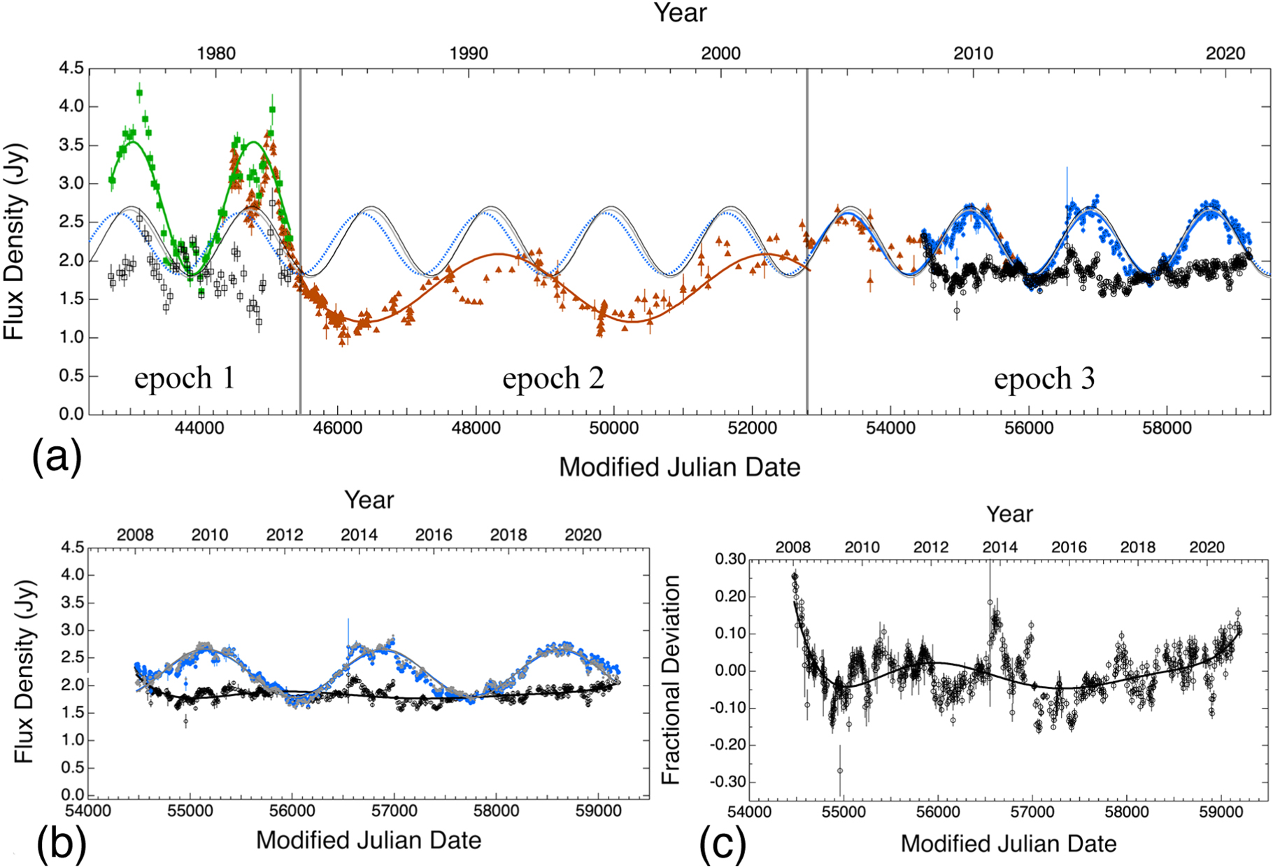 UMRAO Observations: The UMRAO light curve is shown by the brown triangular data points in Figure 1. The long-term 14.5 GHz total flux density data for PKS 2131−021 were obtained with the 26 m equatorially mounted, prime-focus University of Michigan paraboloid as part of the UMRAO monitoring program that operated from the mid-1960s until 2012.5 and included observations of total flux density and linear polarization at three centimeter-band wavelengths for hundreds of blazars in a dedicated AGN program. A description of the general observation and calibration procedures is given in Aller et al. (1985). In brief, at 14.5 GHz dual, rotating, linearly polarized feed horns placed symmetrically about the prime focus were employed and alternated beams on the source; these fed a broadband uncooled high electron mobility transistor (HEMT) amplifier with a bandwidth of 1.68 GHz. Each observation shows the average from 1 day of a series of on–on measurements obtained by alternating between rotating feed horns during an interval of 30–40 minutes. The cadence was one of these averages per week. The adopted flux density scale (Baars et al. 1977) uses Cas A as the primary calibrator, accounting for its measured decay rate (Dent et al. 1974a). Observations of secondary calibrators were interleaved approximately every 2 hr throughout each 14.5 GHz observing run to monitor pointing and gain changes. The standard deviation associated with each daily flux density observation is computed from the system noise temperature and the number of individual on–on measurements made on the particular day. The standard error estimates shown include the effects of measurement noise, the errors introduced by uncertainties in the pointing corrections applied to the observations, and the uncertainties in determining the antenna gain as a function of time. The goal of the UMRAO program was to detect and follow blazar flares, so in general the cadence of the observations was set by the variability state (high cadence during flaring). However, as a member of the UMRAO BL Lac sample (Aller et al. 1999), PKS 2131−021 was also routinely observed approximately every 3 months. Additionally, during the last decade of operation, quasi-simultaneous observations (within a week) were matched to MOJAVE epochs for calibration of the Very Long Baseline Array (VLBA) data.