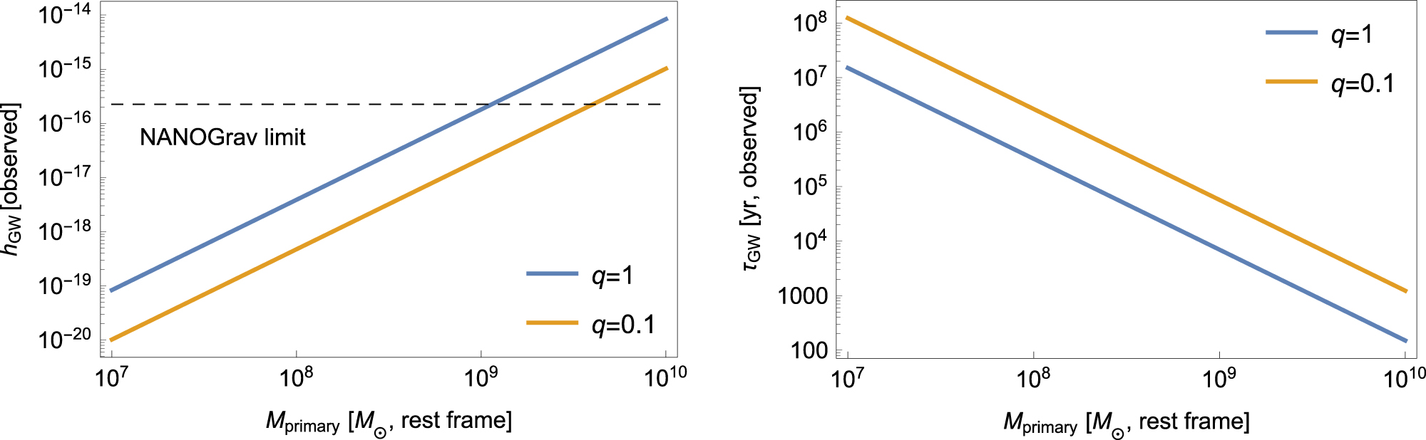 Figure 12. Mass limits from GW observations. Both the period and the location of PKS 2131−021 are in the windows of maximum sensitivity for the NANOGrav pulsar timing array (Aggarwal et al. 2019). Here we show the observed GW strain and time to coalescence for primary−SMBH rest masses ranging from 107 to 1010 M⊙ and for binary mass ratios of q = 1.0 and q = 0.1.