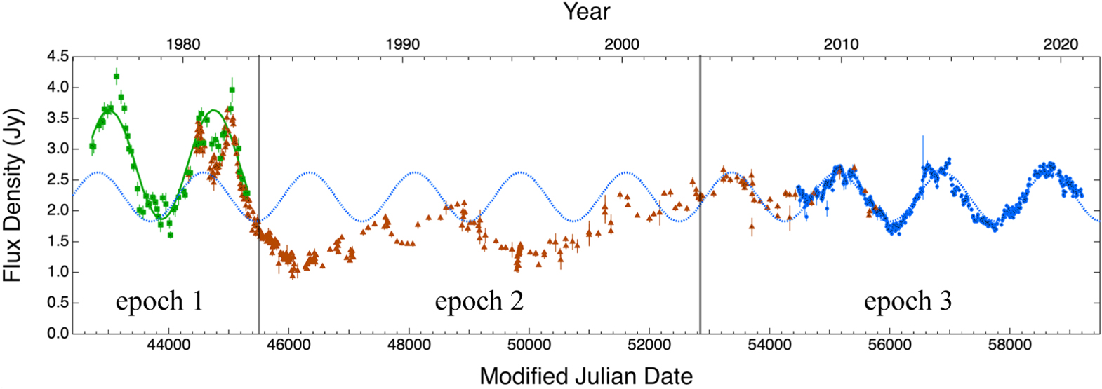 The 45.1 yr radio light curve of PKS 2131−021 is shown in Figure 1. It is immediately apparent to the eye that there are three distinct epochs, which are demarcated by the vertical black lines in Figure 1: In epoch 1 a strong 1.5-cycle periodic oscillation is seen in the Haystack data (green squares), of which the last half-cycle is also seen in the UMRAO data (brown triangles). There follows a 20 yr period (epoch 2) in which the oscillation of epoch 1 is not seen. In 2003 we enter the third epoch, in which a strong oscillation is again seen and which has very nearly the same period (within 2%) and also the same phase (within 10% of a cycle) as the periodic oscillation of epoch 1. This analysis by inspection is well corroborated by both the Lomb–Scargle (LS; Lomb 1976; Scargle 1982) and weighted wavelet Z-transform (WWZ; Foster 1996) analyses we carried out (see Section 3).