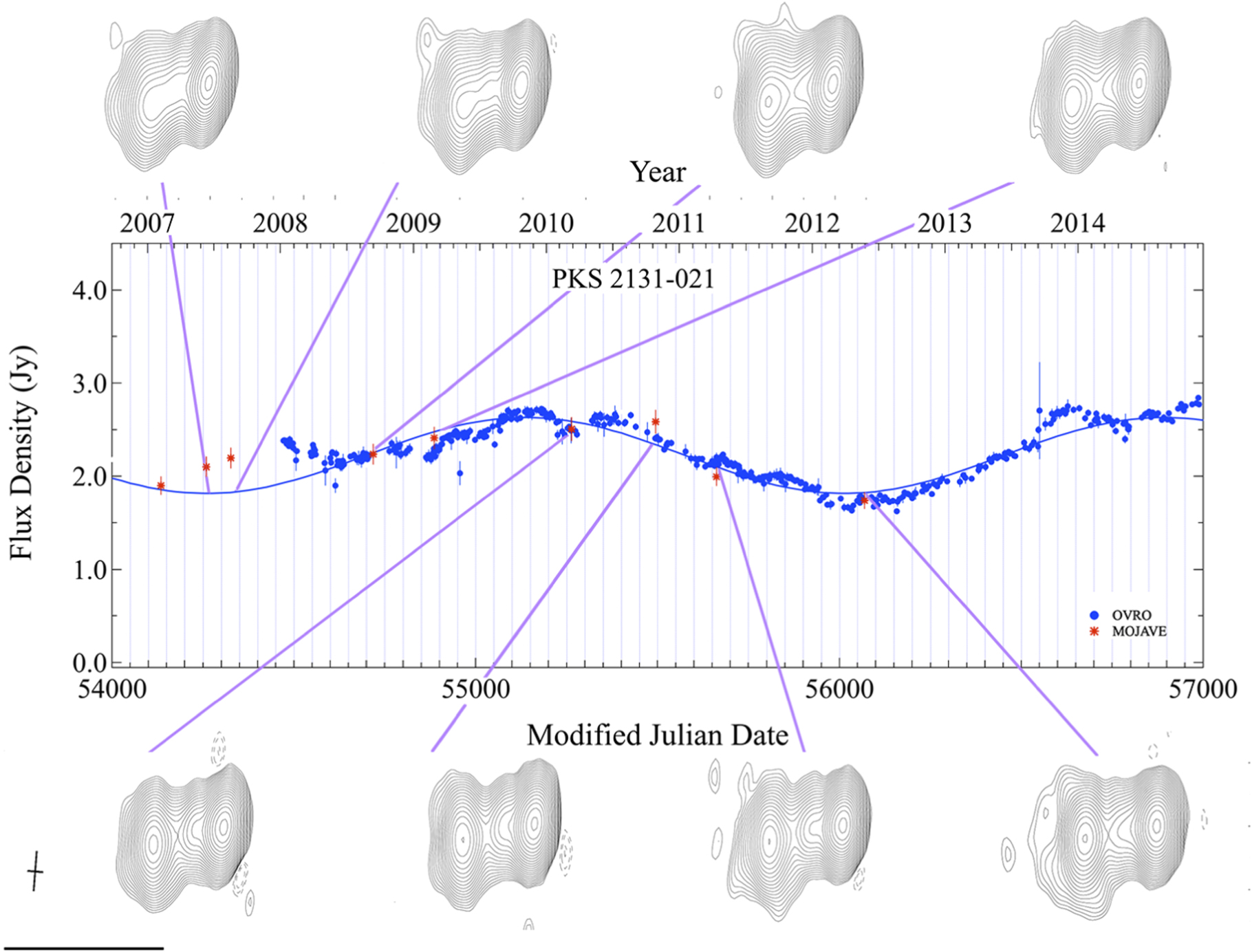 Figure 2. MOJAVE 15 GHz VLBI maps (Lister et al. 2018) matched to the OVRO 15 GHz light curve (blue circles) and least-squares sine-wave fit to the OVRO data (blue line). The total flux densities measured by MOJAVE are shown by the red asterisks. The maps show the basic core−jet structure of PKS 2131−021 on parsec scales. The bar at the lower left indicates the scale of 5 mas (∼42 pc) of all the maps, and the small cross indicates the typical FWHM beam size and orientation. Detailed comparison of the maps, models, and light curve shows that it is the core (primarily) and innermost component (partly), at ∼0.3 mas from the core, that are responsible for the periodic flux density variations.