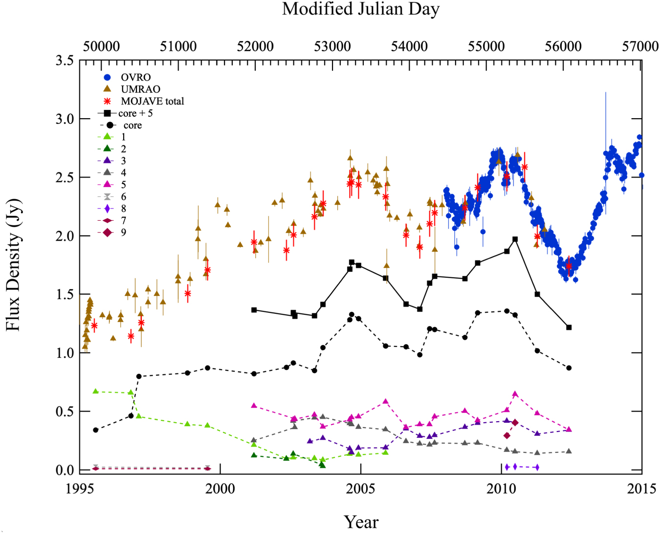 Standard image High-resolution imageIn Figure 3 we show the light curves of the individual milliarcsecond jet components measured by MOJAVE (Lister et al. 2019). These overlap the 2005 peak in the sine-wave signal seen by UMRAO and the 2010 peak seen by both UMRAO and OVRO. Note that the core component and the component nearest to the core (component 5) are the components that produce the periodic signal. The sum of these two components is shown by the solid line in Figure 3. In Figure 4 we show the separations of the individual components from the core. Component 5 is stationary (μ = 3.0 ± 1.9 μas yr−1; Lister et al.2019) at a separation of 0.3 mas (0.2 pc) from the core. We note that, while we might expect all of the periodic variability to arise in the core, in view of the small separation of component 5 from the core, it is not unlikely that the core and component 5 will vary in phase on the timescale of the observed periodicity.