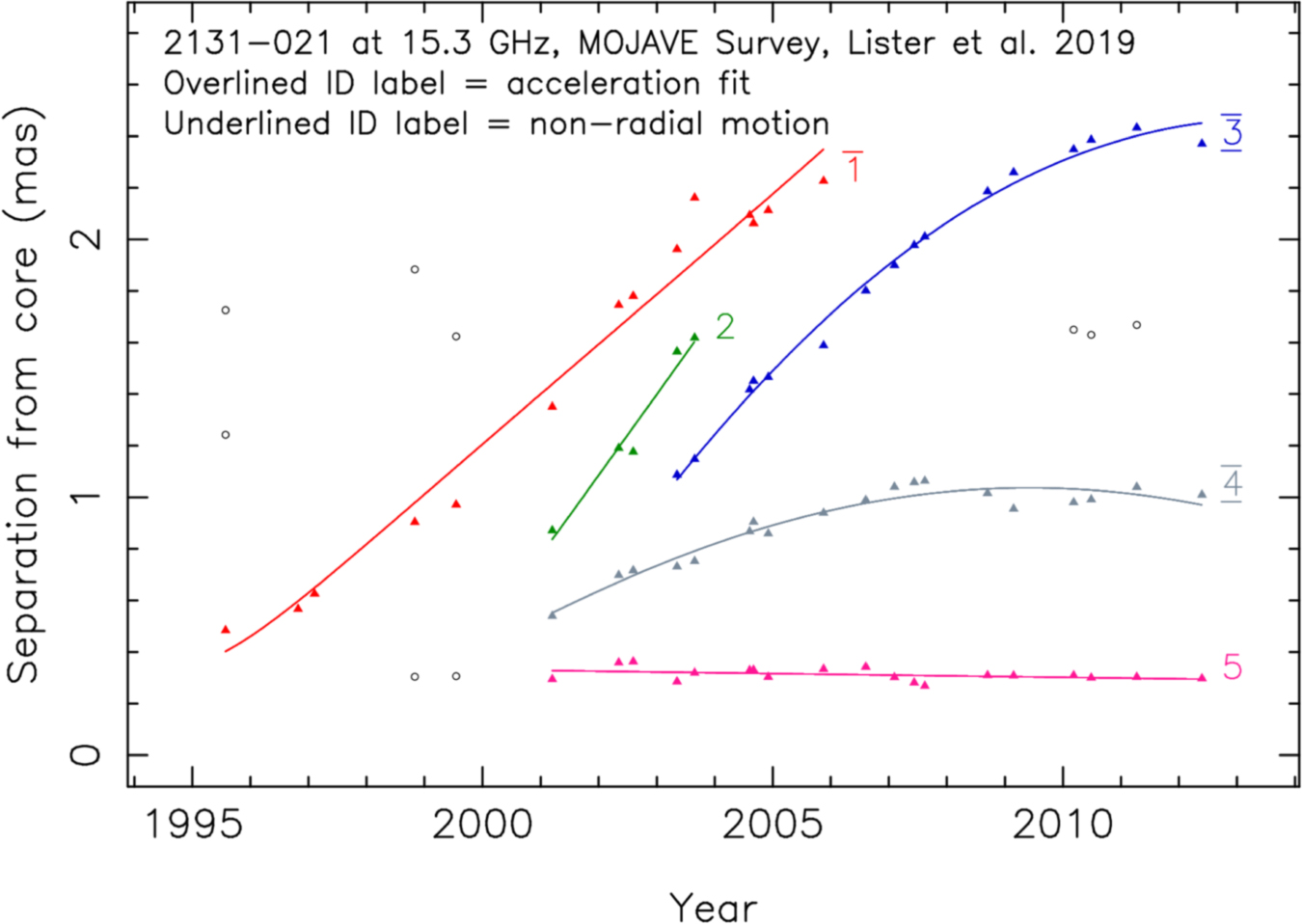 Kinematic analysis (Lister et al. 2019) identified five distinct features in the jet, each having a different apparent speed. The innermost feature (id = 5) had no detectable motion over a 12 yr period, while the speeds of the other features ranged from 2.6c ± 0.2c (id = 4) to 20c ± 2.6c (id = 2). Most of the moving features display accelerated and/or nonradial motions on the sky that are exaggerated by projection effects. Given the maximum apparent speed, the jet viewing angle, θ, is constrained to lie within 5