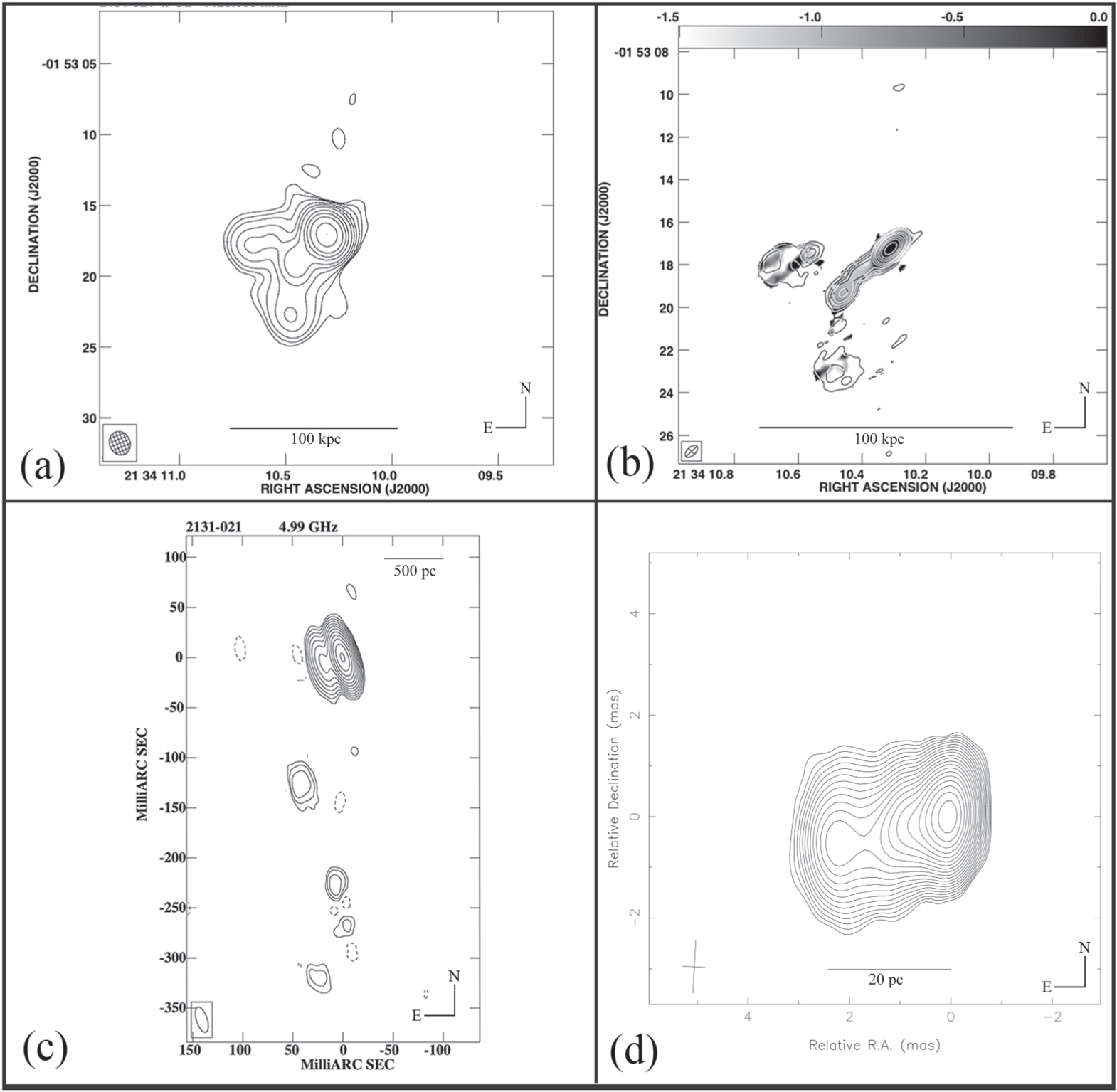 Figure 5. Maps of PKS 2131−021 on different angular scales. (a) VLA 1.4 GHz map from Rector & Stocke (2001). (b) VLA 4.86 GHz map from Rector & Stocke (2003); the gray scale shows the 4.86–8.46 GHz spectral index, which shows that the core has a flat spectrum and the jet has a steep spectrum. (c) EVN+MERLIN 4.99 GHz map from Cassaro et al. (2002). The rms noise level is 0.2 mJy beam−1, and the peak flux density is 1349 mJy beam−1. (d) Stack of 24 MOJAVE images (Lister et al. 2019) from 1995 July 28 to 2012 May 24. FWHM beamwidth: 1.04 × 0.45 mas in position angle −3°. Contours: