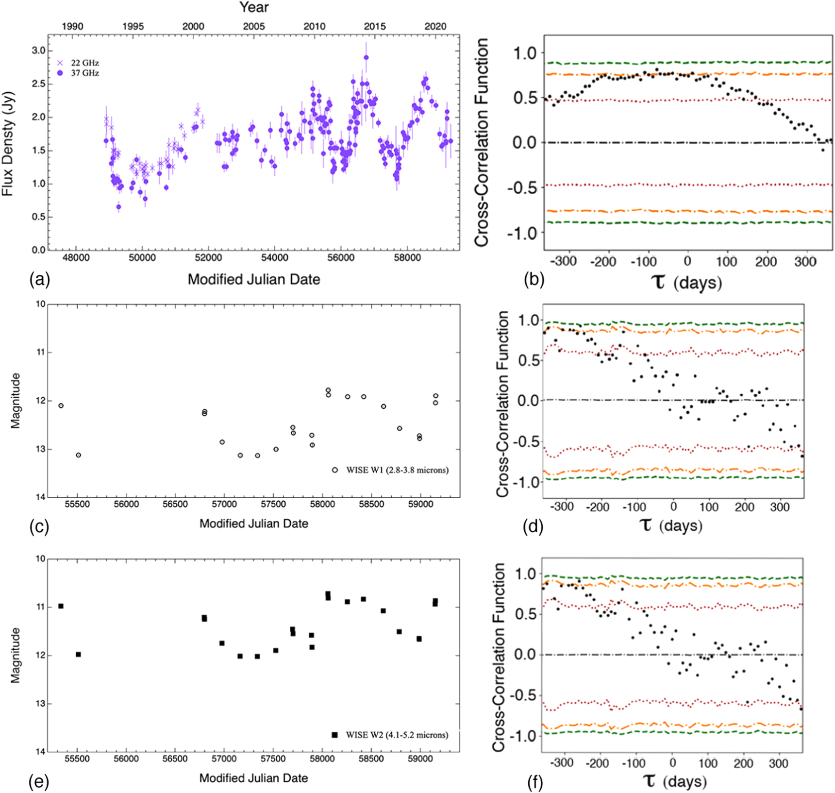 Figure 6. PKS 2131−021 multifrequency light curves and cross-correlations. (a) Light curves at 22 GHz (purple crosses) and 37 GHz (purple circles) from MRO. (b) Cross-correlation of the MRO 37 GHz and OVRO 15 GHz light curves. (c) WISE infrared light curve in the W1 (2.8–3.8 μm) band. (d) Cross-correlation of the WISE W1 (using flux density) and OVRO 15 GHz light curves. (e) WISE infrared light curve in the W2 (4.1–5.2 μm band). (f) Cross-correlation of the WISE W2 (using flux density) and OVRO 15 GHz light curves. In both panels (c) and (e) the error bars are smaller than the symbols. The pink, orange, and green dashed curves indicate the 1σ, 2σ, and 3σ significance levels of the cross-correlation, respectively, using our simulated light curves, which assume a simple power-law form with a slope of 2, typical for blazars in these bands.