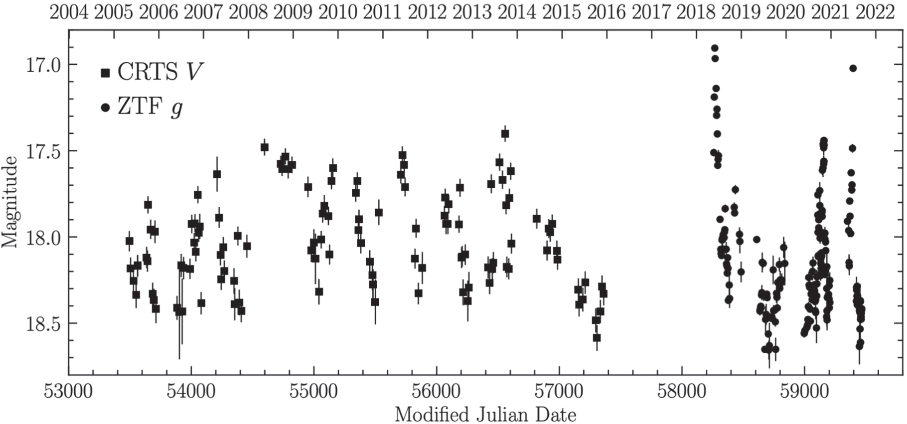 The archival optical light curve of the blazar is presented in Figure 7. It consists of 119 V-band epochs from the Catalina Real-Time Transient Survey (CRTS; Drake et al. 2009) and 203 g-band epochs from the Zwicky Transient Facility (ZTF; Graham et al. 2019; Masci et al. 2019). The CRTS data were collected between 2005 May and 2015 December using the 0.7 m Catalina Schmidt Telescope located north of Tucson, Arizona. The ZTF data were taken between 2018 May and 2021 September with a wide-field camera mounted on the Palomar 48-inch Oschin (Schmidt) telescope.