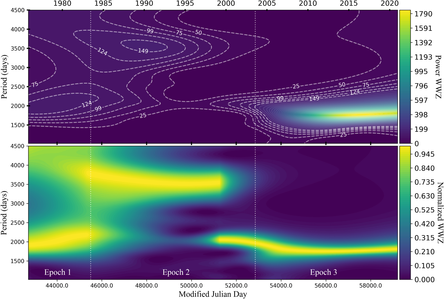 Figure 8. Plots of the WWZ statistic computed from the PKS 2131−021 45.1 yr light curve. Top panel: WWZ statistic plot, in which the color scale at the right and the contour levels on the plot represent the value of the WWZ statistic (see Appendix B). In this panel all the features apart from the feature in epoch 3 are almost invisible because they are more than an order of magnitude weaker than the epoch 3 feature. Bottom panel: time-normalized WWZ plot of the 45.1 yr light curve of PKS 2131−021. Here we normalized each of the 164 100-day time bins by dividing the power across all the periods in each 100-day time bin by the maximum power in the bin. Thus, every time bin has a maximum power of unity. This enables us to see clearly how the periods change over the whole 45.1 yr span of the observations.