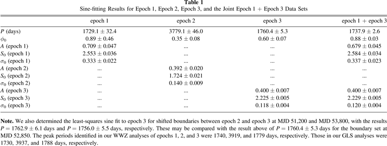 Note. We also determined the least-squares sine fit to epoch 3 for shifted boundaries between epoch 2 and epoch 3 at MJD 51,200 and MJD 53,800, with the results P = 1762.9 ± 6.1 days and P = 1756.0 ± 5.5 days, respectively. These may be compared with the result above of P = 1760.4 ± 5.3 days for the boundary set at MJD 52,850. The peak periods identified in our WWZ analyses of epochs 1, 2, and 3 were 1740, 3919, and 1779 days, respectively. Those in our GLS analyses were 1730, 3937, and 1788 days, respectively.
