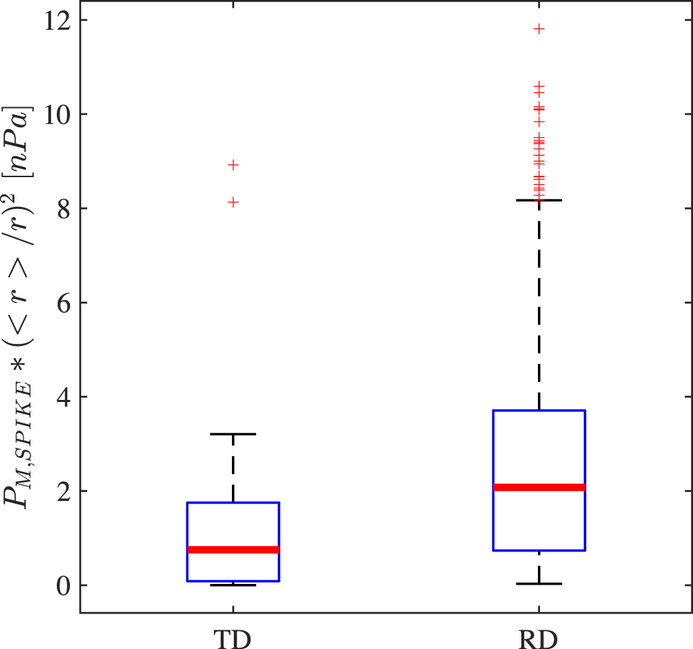 Figure 4 shows a boxplot of the normalized magnetic pressure, categorized based on switchback magnetic discontinuity type. The normalization factor (< r > /r)2 allows the comparison of magnetic pressure PM inside switchback spike regions observed at various heliocentric distances, r. The parameter < r > denotes the average heliocentric distance for all switchback observations. It indicates that the median (red bar) normalized magnetic pressure PM of TD-type (median = 0.75 [nPa]) switchbacks is 64% smaller than that of RD-type (median = 2.08 [nPa]) switchbacks. The difference is found to be statistically significant (probability p > 0.95).