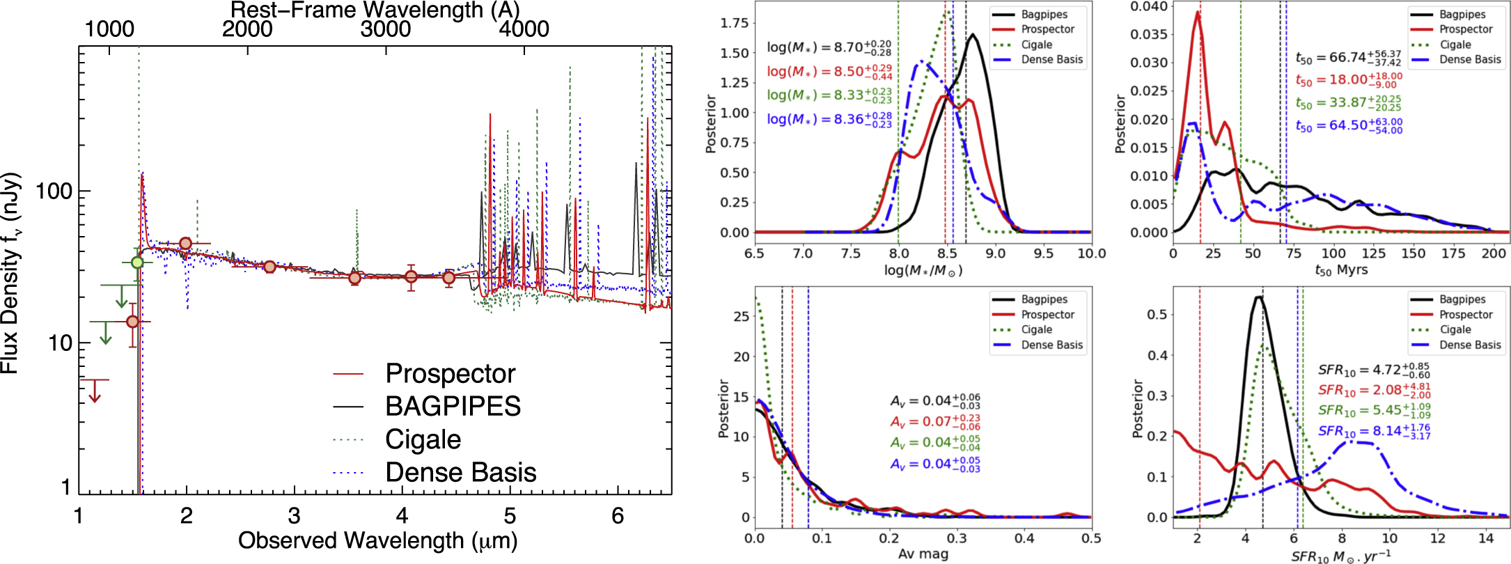 Figure 4. (Left) Our fiducial photometry of Maisie's Galaxy alongside best-fit SED models from the SED-fitting codes Prospector (red solid, fiducial; see Table 1), Bagpipes (black solid), Cigale (green dotted), and Dense Basis (blue dotted). (Right) Posterior distributions of the key stellar population properties from all four codes. The panels show stellar mass, mass-weighted age, dust attenuation, and SFR averaged over the last 10 Myr. The vertical dotted lines indicate the mean of the posteriors. Posteriors of attenuation are consistent between all four codes. Prospector prefers a younger age than the other three because of a recent burst in the SFH of this object. As a consequence of the burst, Prospector also estimates a lower SFR. The four estimates of the stellar mass posteriors exhibit significant overlap, though the median values differ by ±0.2 dex. Future observations in the rest optical with MIRI could break these degeneracies.