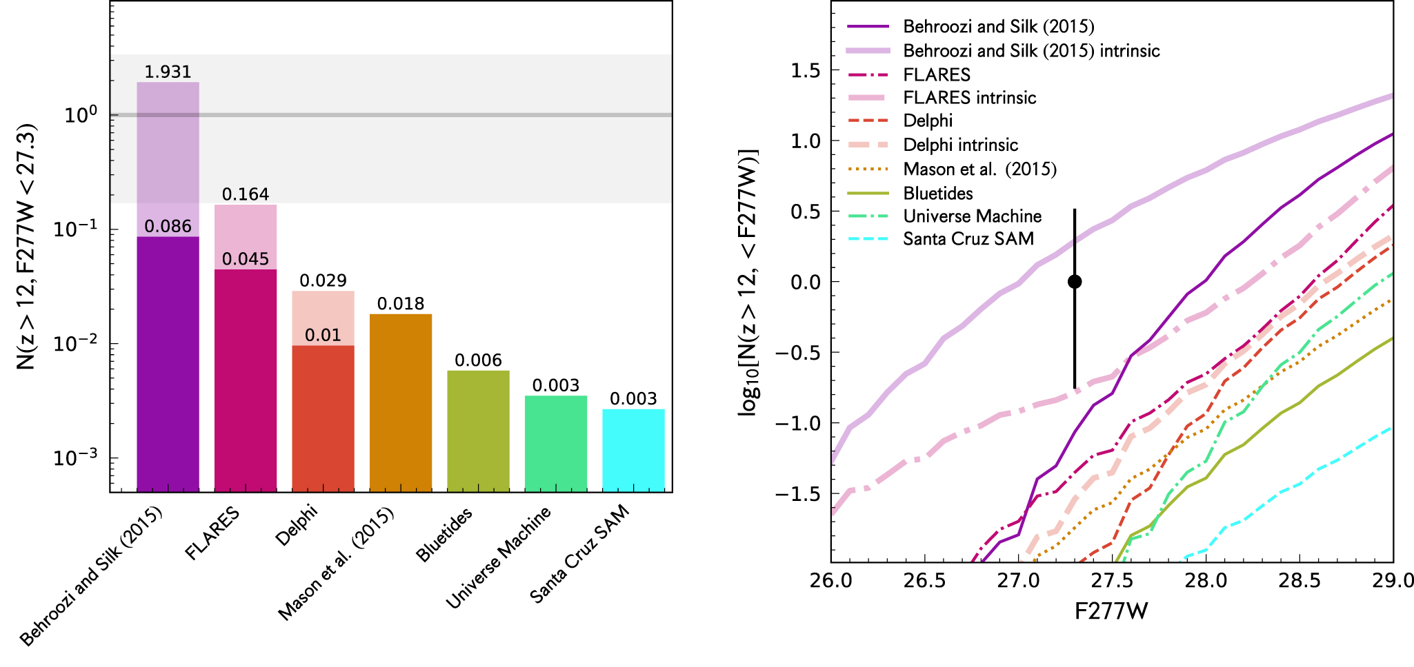 Figure 5. Theoretical predictions from a range of simulations in the recent literature. The left panel shows the predicted number of sources at m < 27.3 (the brightness of our source) and z > 12 over our survey area of 34.5 arcmin2. The vertical axis and the values above each bar give the number predicted. Dark (light) shading denotes the value derived from models with (without) dust attenuation applied. The right panel shows these same theoretical predictions, now showing the cumulative number as a function of apparent magnitude. The bulk of these models predict that m ∼ 27 galaxies at z ≳ 12 are not highly likely, though the Behroozi & Silk (2015) model, which has no accelerated decline in the cosmic SFR density at z > 8, has the least tension. However, our detection of one source has a large Poisson (and cosmic variance) uncertainty (gray shading in the left panel; error bar in the right), so strong conclusions cannot yet be made.