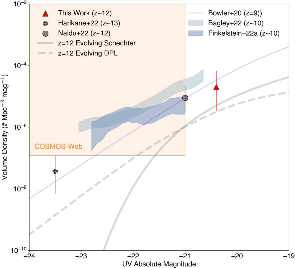 Standard image High-resolution imageAs noted by several previous studies, the bright end of the luminosity function at z ≥ 9 exhibits an interesting excess over predicted levels (e.g., Morishita et al. 2018; Bowler et al. 2020; Rojas-Ruiz et al. 2020; Bagley et al. 2022; Finkelstein et al. 2022). While our survey area does not yet probe the volume densities needed to reach these brighter potential z = 12 galaxies, if the high-redshift luminosity function follows a DPL form, the forthcoming 0.6 deg2 COSMOS-Web survey (PIs: Kartaltepe & Casey) should be able to discover this population. In combination with the full Cycle 1 slate of surveys, including the completed CEERS imaging, it will afford a more complete view of the z = 12 universe.