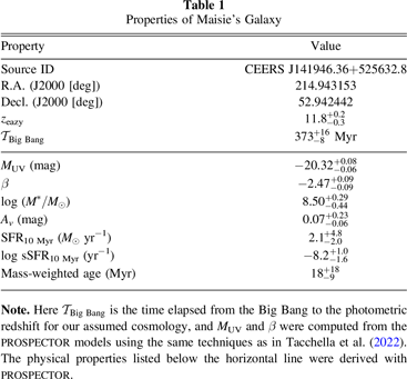 is the time elapsed from the Big Bang to the photometric redshift for our assumed cosmology, and MUV and β were computed from the Prospector models using the same techniques as in Tacchella et al. (2022). The physical properties listed below the horizontal line were derived with Prospector.
