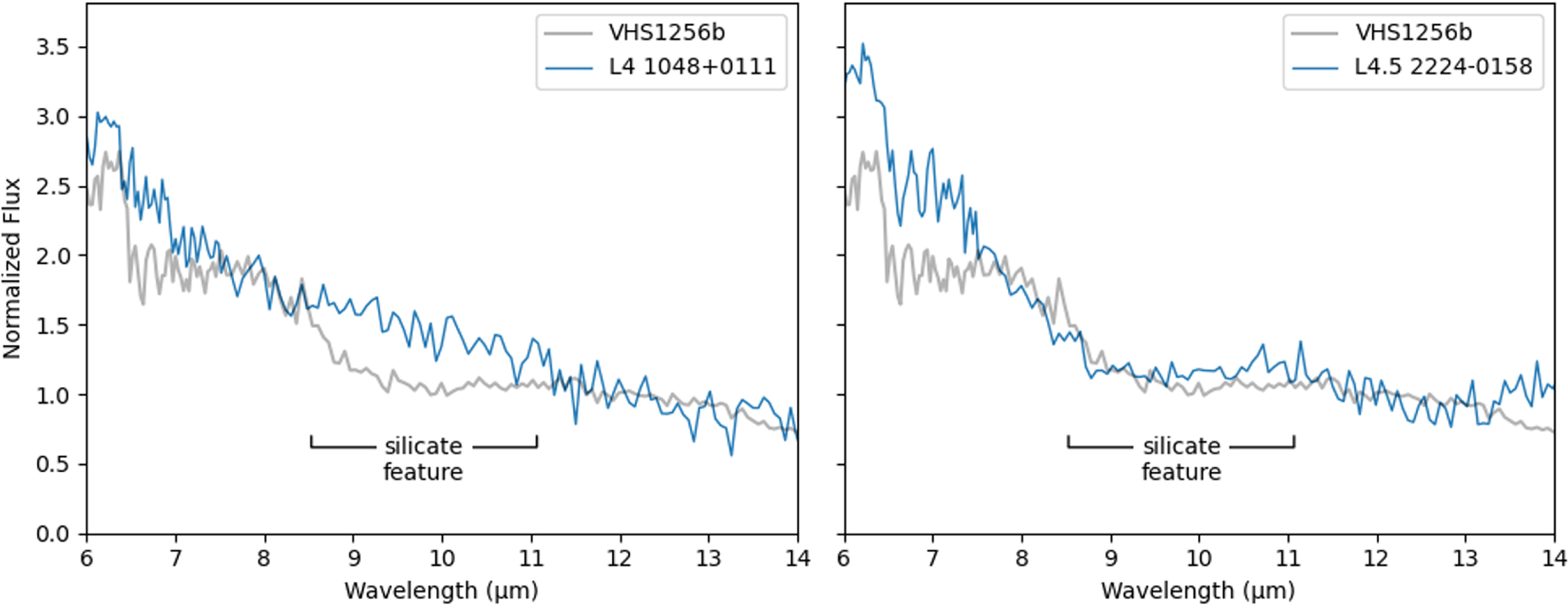 Figure 11. The JWST/MIRI spectrum of VHS 1256 b is a good match to the Spitzer spectrum of 2M2224–0158, which has a prominent silicate absorption feature. 2M1048+0111, which does not have a prominent silicate feature, is shown for comparison. (2M2224–0158 and 2M1048+0111 spectra from Suárez & Metchev 2022).