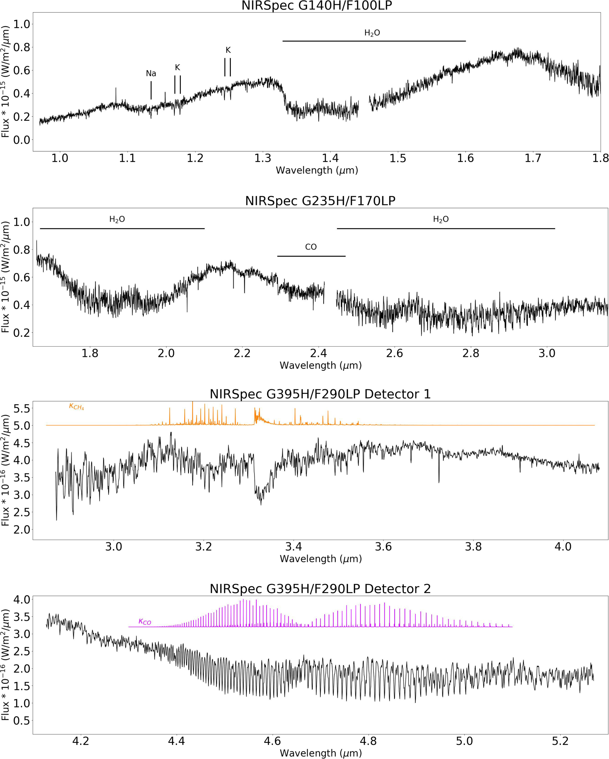 Figure 4. JWST/NIRSpec spectrum of VHS 1256 b, with important molecular gases highlighted. Molecules were identified via visual comparison with template spectra.