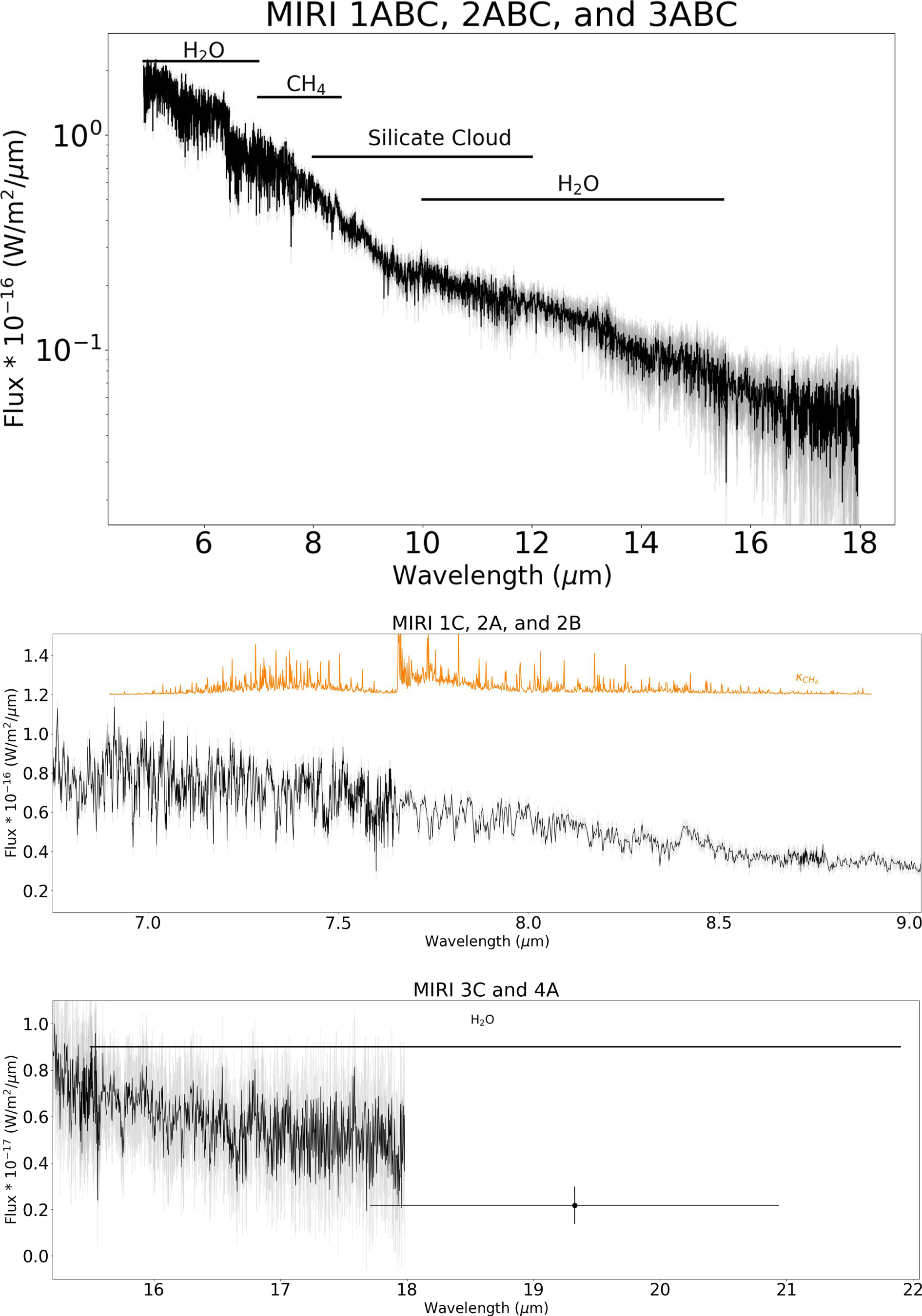 The full reduced spectrum with labeled bandpasses is shown in Figure 2. The NIRSpec (1–5 μm) spectra have an S/N of 50–400 per pixel. The MIRI (4.9–20.94 μm) spectra have an S/N of 7 to 20 per pixel, with hardly any signal in Channel 4 (17.66–28.1 μm). The photometry point from the channel has an S/N of 2.7.