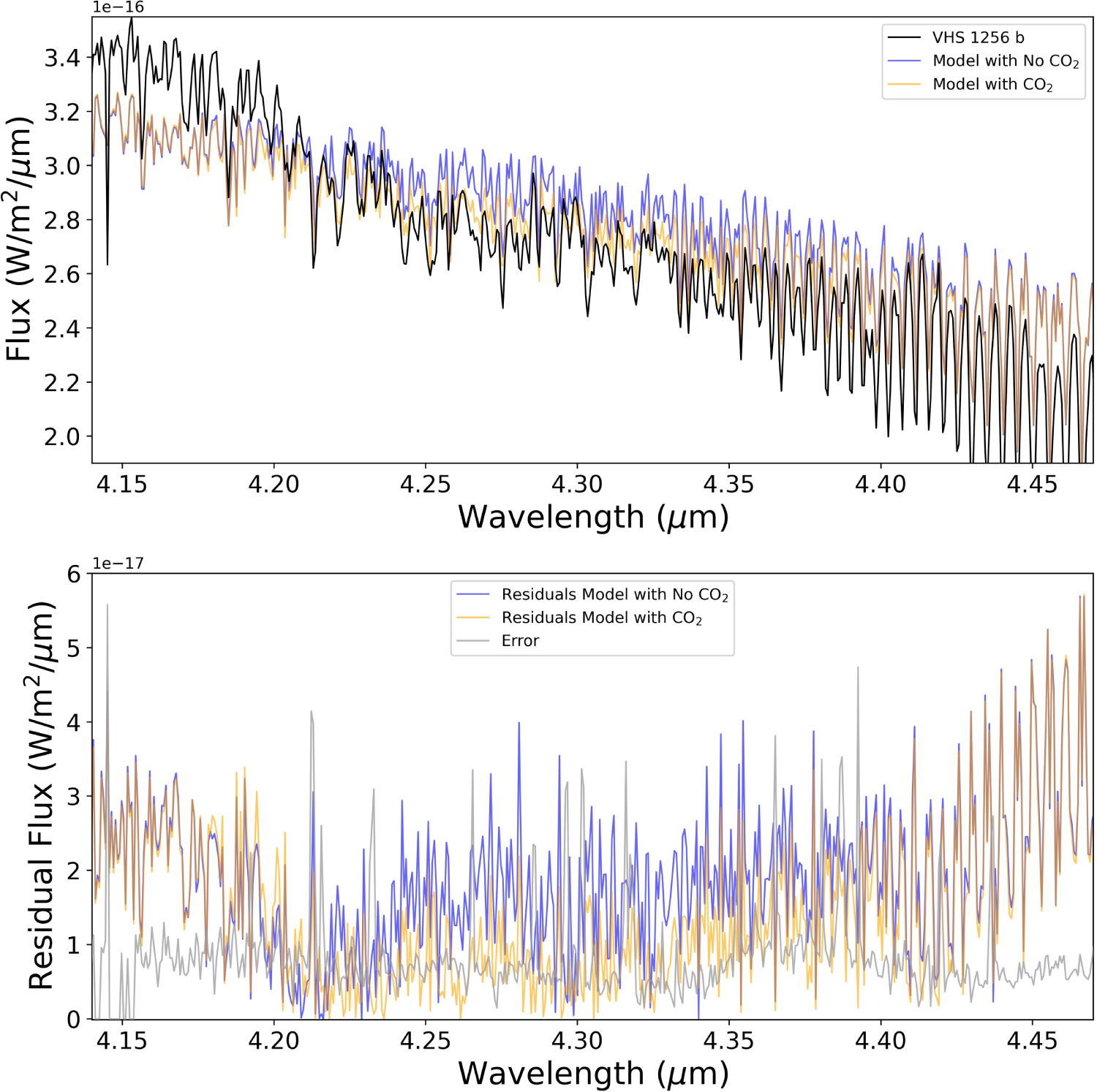Figure 7. The JWST/NIRSpec spectrum of VHS 1256 b compared to two atmospheric models that contain CO2 (orange) and a model with no opacity from CO2 (blue). The data show excess absorption at 4.2 μm, which shows evidence of CO2 absorption. The bottom panel shows residuals between the data and the models with the error plotted in gray. No CO2 shows a larger residual than a model including the opacity of the molecule.