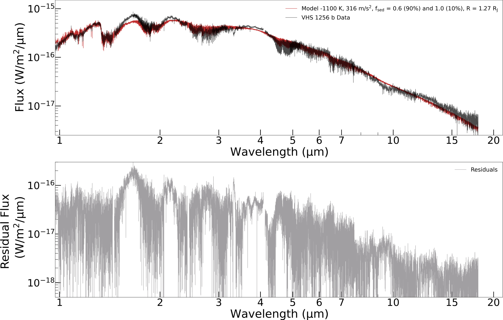 Figure 8. (Top panel) The best-fit model atmospheric model (red) compared to the VHS 1256 b spectrum (black). The residual fluxes between the best-attempt model and VHS 1256 b's spectrum. The largest discrepancies are in the near-infrared and within absorption lines that are muted due to the model's cloudiness.(The data used to create this figure are available.)