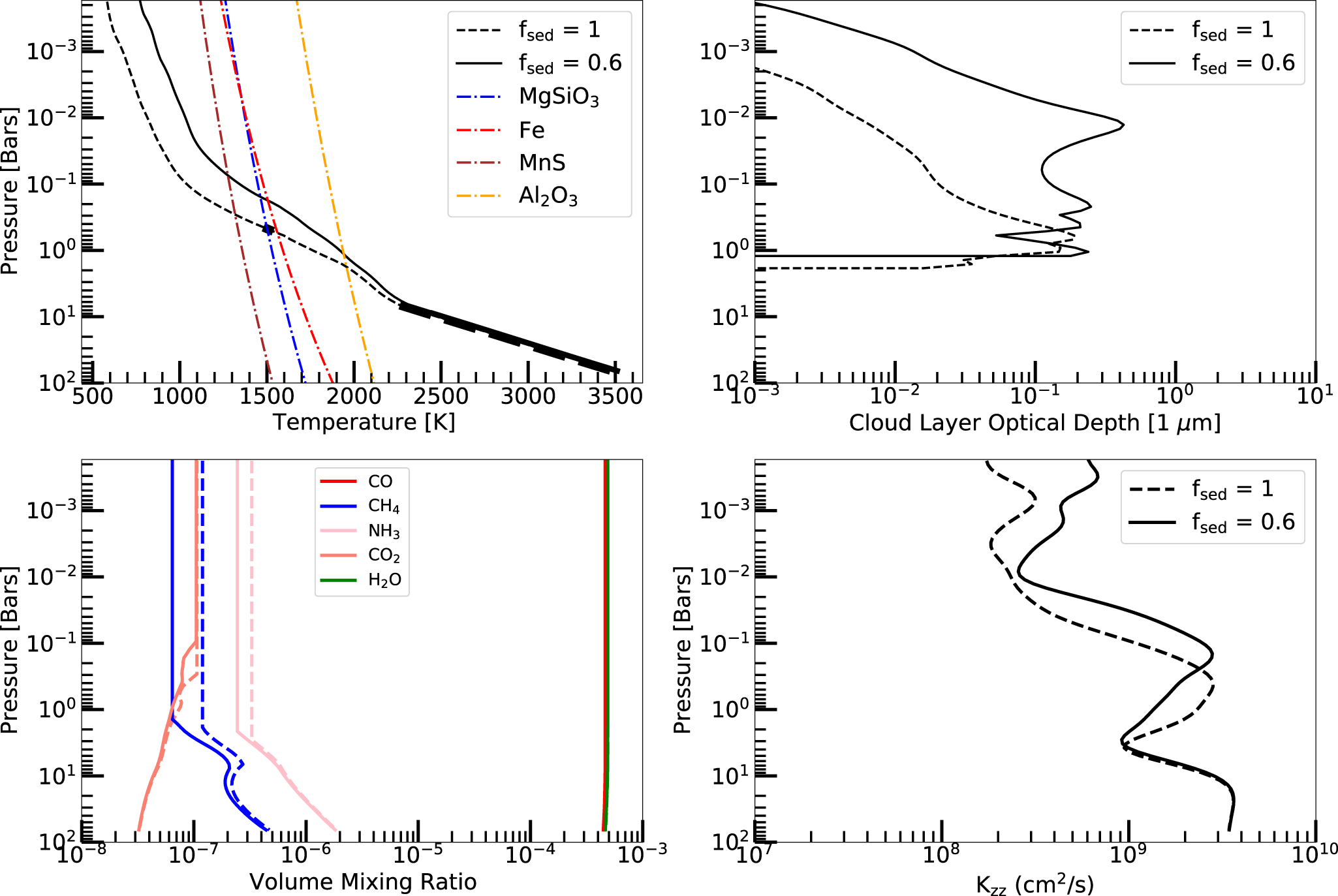Standard image High-resolution imageFigure 9. Atmospheric parameters of VHS 1256 b. Top left: the pressure–temperature profile (black) with convective regions highlighted with thicker black lines. The condensation curves of cloud opacities included within the model are shown as colored lines. Top right: the optical depth profile of the clouds used in the hybrid best-fit model. Lower fsed values produce a higher opacity through a larger region of the atmosphere compare to higher fsed values. Lower left: the abundance of different atmospheric molecules as a function of pressure. Atmospheric mixing influences abundances primarily below log(P) = 0 bars. Lower right: atmospheric mixing, Kzz, as a function of pressure. Stronger mixing occurs at higher pressures.