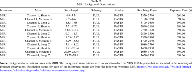 Notes. Background observations taken with MIRI. The background observations were not used to reduce the VHS 1256 b spectra but are included in the summary of program observations. Resolution values for each of the instrument modes are from the following websites: MIRI (https://jwst-docs.stsci.edu/jwst-mid-infrared-instrument/miri-observing-modes/miri-medium-resolution-spectroscopy).