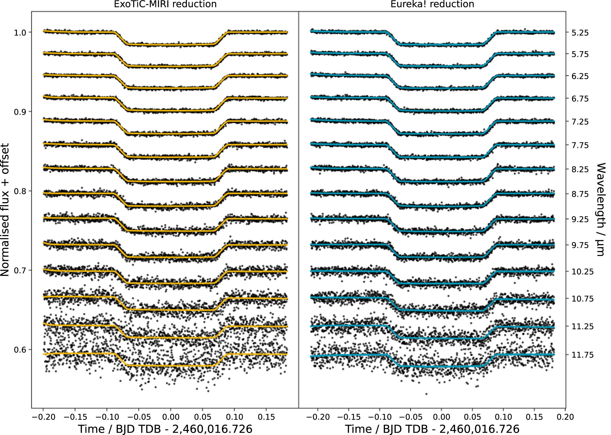 Figure 1. ExoTiC-MIRI (left) and Eureka! (right) spectroscopic transit light curves, binned to a resolution of 0.5 μm, and best-fit models. The times on the x-axis have had the center-of-transit time subtracted and the wavelengths of each light curve are shown on the right-hand y-axis.