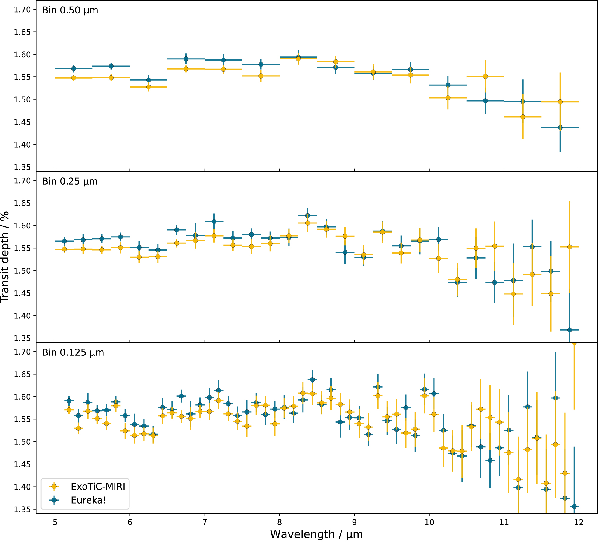 Figure 2. Comparison of transmission spectra generated at three resolutions for both the ExoTiC-MIRI (yellow) and Eureka! (blue) reductions. The resolutions correspond to bin widths of 0.50, 0.25, and 0.125 μm. The systematic differences at wavelengths <8 μm are due to the different linearity corrections used in each reduction (see Section 2.4 for details). All data products and models are available at https://doi.org/10.5281/zenodo.8360121.