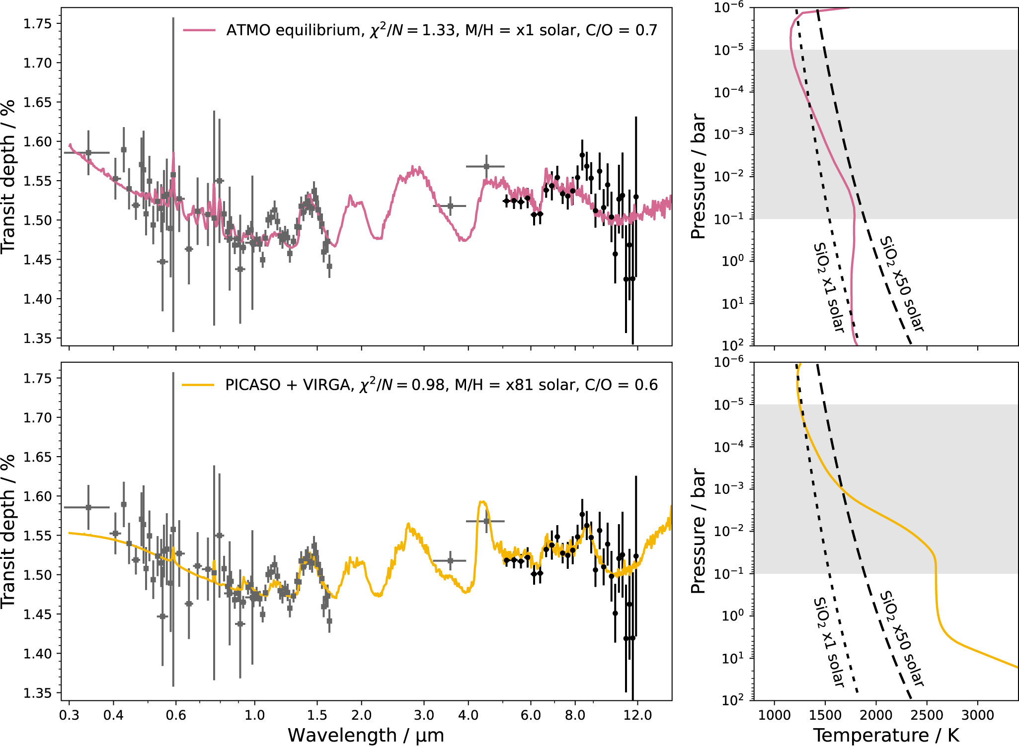Standard image High-resolution imageFigure 3. Atmospheric modeling with ATMO (top panels, with a gray cloud and Rayleigh scattering haze prescription) and PICASO+Virga (bottom panels, with Mie-scattering cloud opacity of SiO2(s) included). Here we show the best-fit transmission spectra applied to a combination of our JWST MIRI LRS data (0.25 μm ExoTiC-MIRI reduction, black circles) and the Alderson et al. (2022) HST + Spitzer data (gray squares). The corresponding pressure–temperature profiles are shown in the right-hand panels, along with SiO2's condensation curves as defined in Equations (3) and (4).