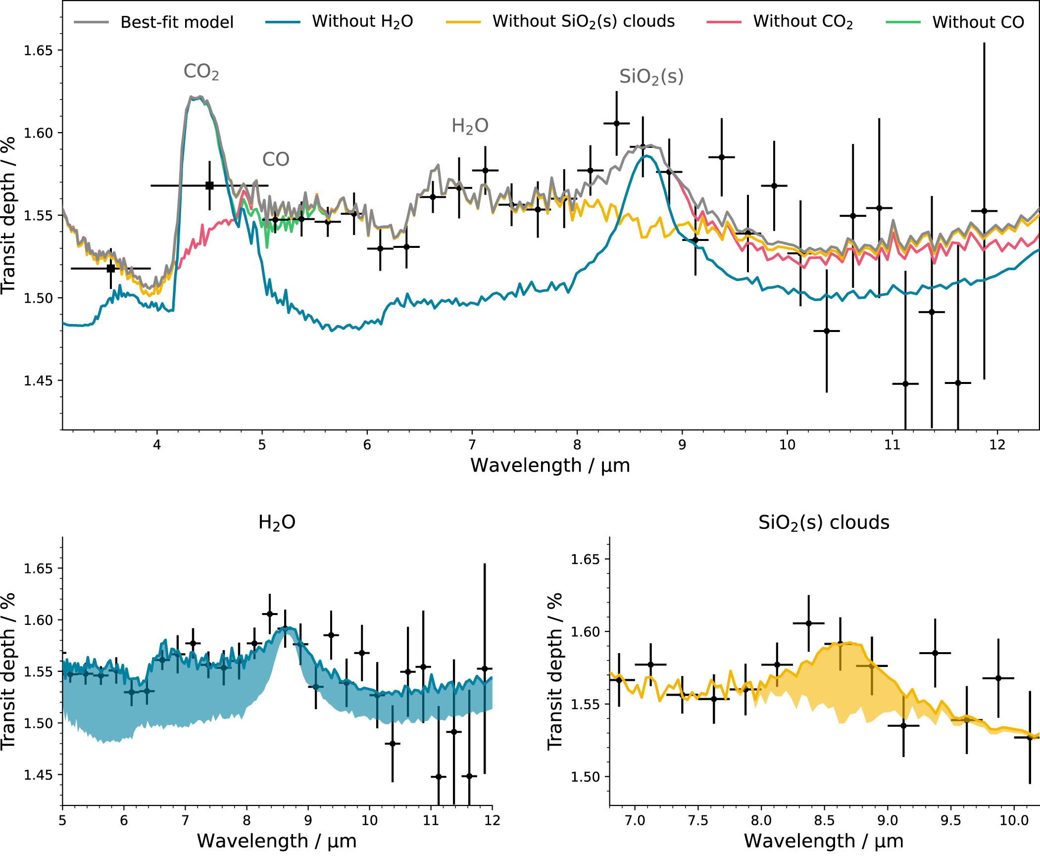 Figure 4. Opacity contributions in our PICASO+Virga atmospheric model. Top panel: the best-fit model (gray) is shown against our JWST MIRI LRS data (0.25 μm ExoTiC-MIRI reduction, black circles) and the Alderson et al. (2022) Spitzer data (black squares). We also show four additional versions of the same best-fit model, each having a different source of opacity removed, to reveal which features can be attributed to which atmospheric species. Bottom panels: zoom in of the opacity contributions (shaded regions) from the two primary atmospheric species, H2O and SiO2(s) clouds, detected at mid-infrared wavelengths. A summary of these modeling results can be found in Table 2.