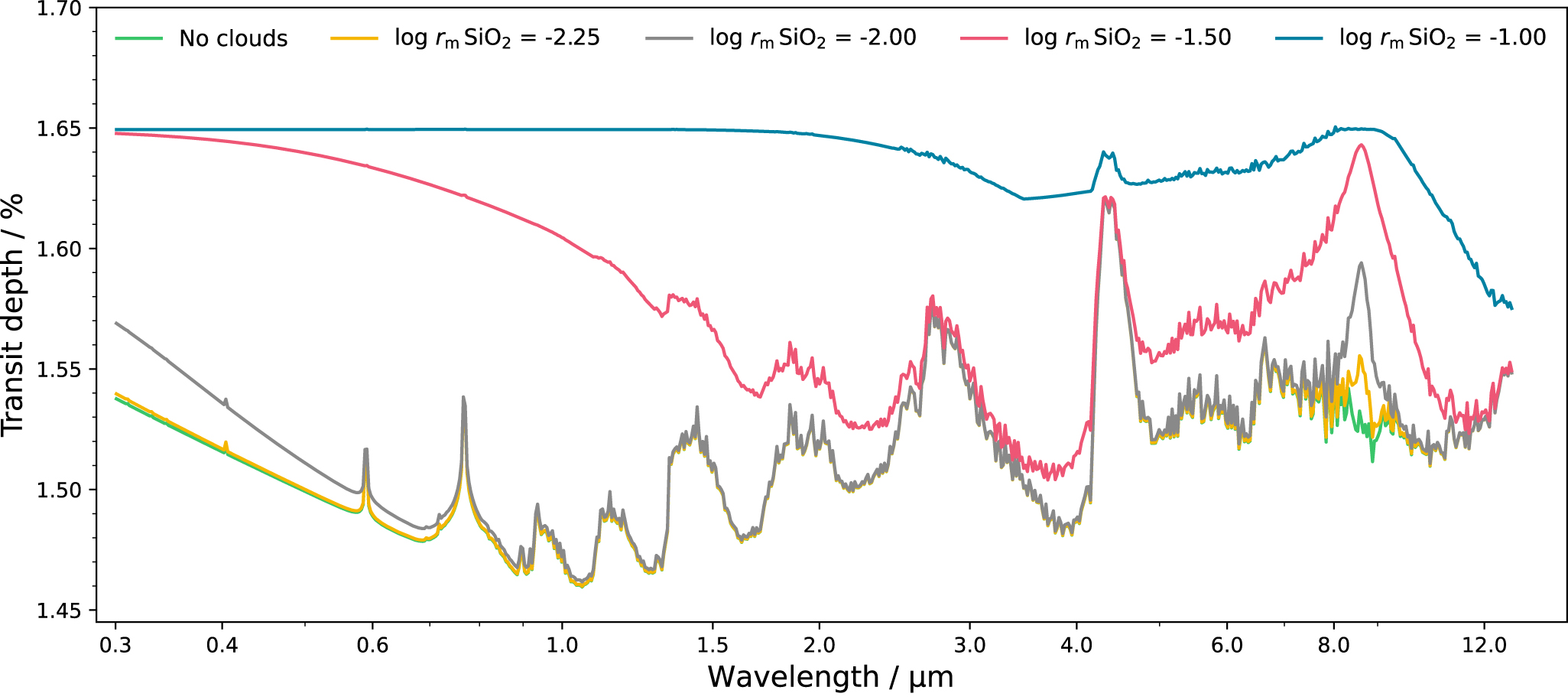 The main cloud species considered in this work have their effective cross sections shown in Figure A1. The dependence of the model transmission spectra on the SiO2(s) cloud particle size is shown in Figure A2.