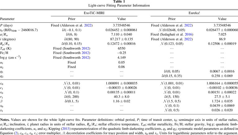 The fitting was performed on both the ExoTiC-MIRI and Eureka!-generated light curves with the Markov Chain Monte Carlo (MCMC) algorithm emcee (Foreman-Mackey et al. 2013). In both the ExoTiC-MIRI and Eureka! light-curve fitting, the white light curve was first fit to constrain the best-fit values for the center-of-transit time. Additionally, in the ExoTiC-MIRI light-curve fitting the semimajor axis and inclination were estimated from the white light curve, while Eureka! assumed the values from Alderson et al. (2022). These system parameter values were then held fixed in the spectroscopic light-curve fitting; see Table 1 for a complete list of system parameters and prior distributions used in the light-curve fitting. The transmission spectra (