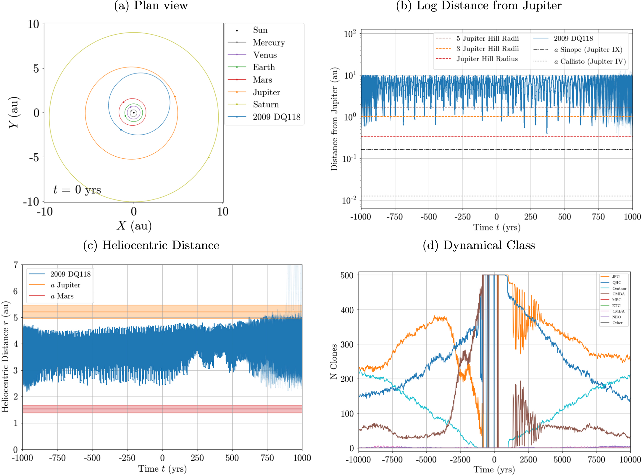 Figure 2. Dynamical evolution of 2009 DQ118 orbital clones indicating changes to its orbit and dynamical class over short timescales. (a) Orbits of 2009 DQ118 and the planets at t = 0, UT 2023 April 11. Note the proximity of the orbits of 2009 DQ118 and Jupiter. (b) Log distance between 2009 DQ118 orbital clones and Jupiter as a function of time. Distances of 5, 3, and 1 Hill radii are marked to emphasize increasingly strong perturbations from close encounters. Semimajor axes of two Jovian moons are given for reference. Note that strong downward spikes, representing close encounters, correspond with changes in the orbit. Also note the onset of dynamical chaos before ∼−750 yr and after ∼600 yr. (c) Heliocentric distance of 2009 DQ118 orbital clones. Note how 2009 DQ118 clones begin to cross within the perihelion distance of Jupiter (shaded orange region below the orange line) after ∼600 yr. (d) Dynamical class of 2009 DQ118 over ±10 kyr (vs ±1 kyr for panels (b) and (c)). These values correspond to those given in Table 2.