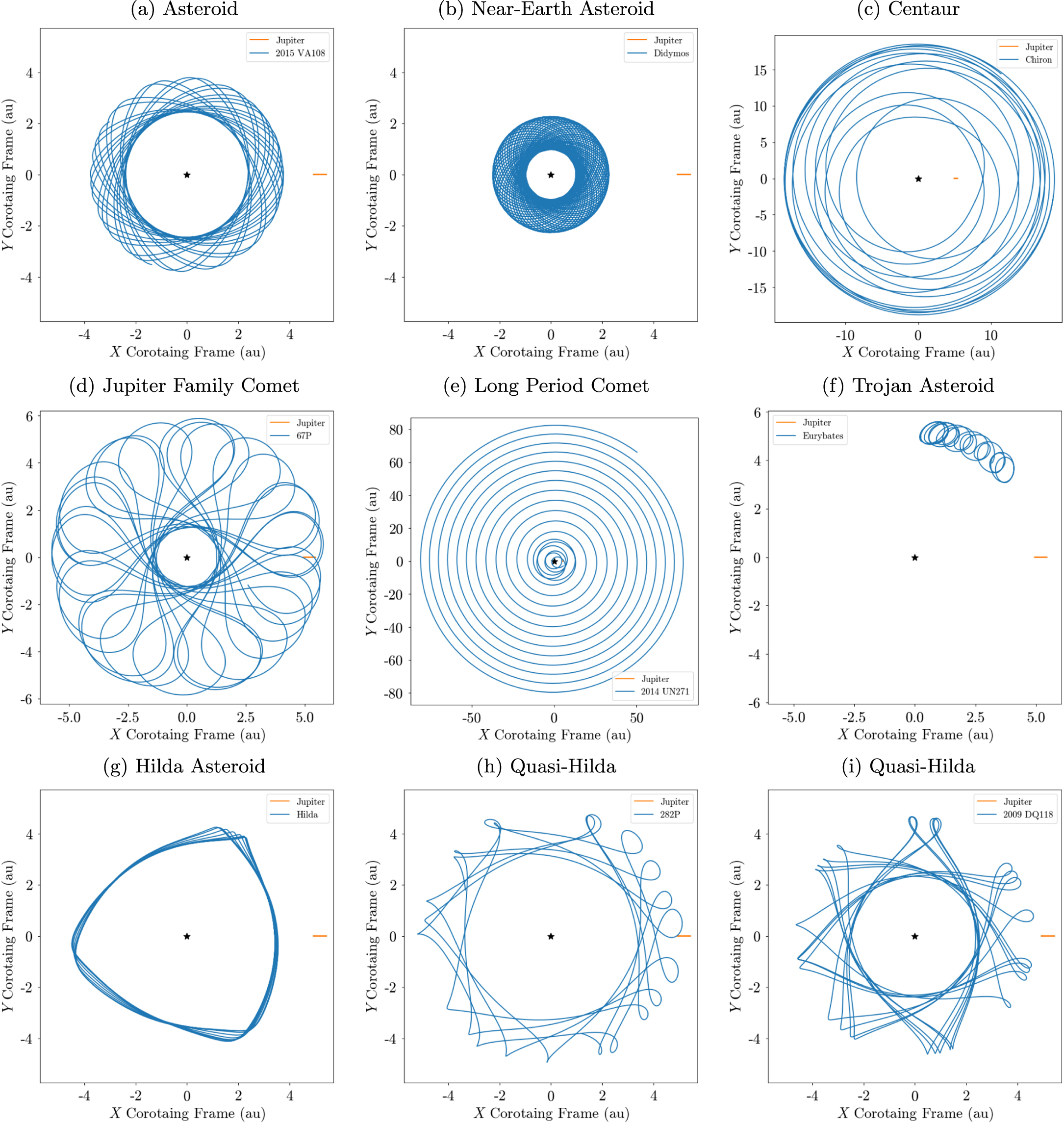 Figure 3. Orbits of representative bodies (blue curves) from eight dynamical classes in the corotating frame with Jupiter (orange line) illustrating the similarities between 2009 DQ118 and other quasi-Hildas. Each subplot shows 200 yr of orbital integration in this reference frame. (a) Active asteroid 2015 VA108 orbits in the main asteroid belt and is a candidate main-belt comet (Chandler et al. 2023). (b) Near-Earth binary asteroid (65803) Didymos-Dimorphos was the target of the NASA Double-Asteroid Redirection Test mission (DART). It is the first artificial active asteroid (Li et al. 2023). (c) Active Centaur (2060) Chiron (95P) resides between the orbits of Jupiter and Uranus. (d) JFC 67P/Churyumov–Gerasimenko crosses the orbits of Jupiter and Mars. It was visited by the ESA Rosetta spacecraft. (e) Long-period comet C/2014 UN271 (Bernardinelli–Bernstein) is currently inbound from the Oort cloud and will reach its perihelion, near the orbit of Saturn, in 2031 January. Because this comet is highly inclined (i ≈ 95°), it appears to be interior to the orbit of Jupiter in part of this X–Y projection. (f) Trojan asteroid (3548) Eurybates in a characteristic Trojan tadpole orbit indicative of a 1:1 mean-motion resonance with Jupiter. Eurybates is a target of the NASA Lucy spacecraft mission. (g) Asteroid (153) Hilda in its iconic 3:2 interior mean-motion resonance with Jupiter. Hilda asteroids are defined as being in this resonance and also display this trilobate pattern in this frame. (h) Active quasi-Hilda 282P/(323137) 2003 BM80 displays a typical asymmetric quasi-Hilda corotating pattern (Chandler et al. 2022). (i) 2009 DQ118 with a quasi-Hilda orbit similar to 282P.